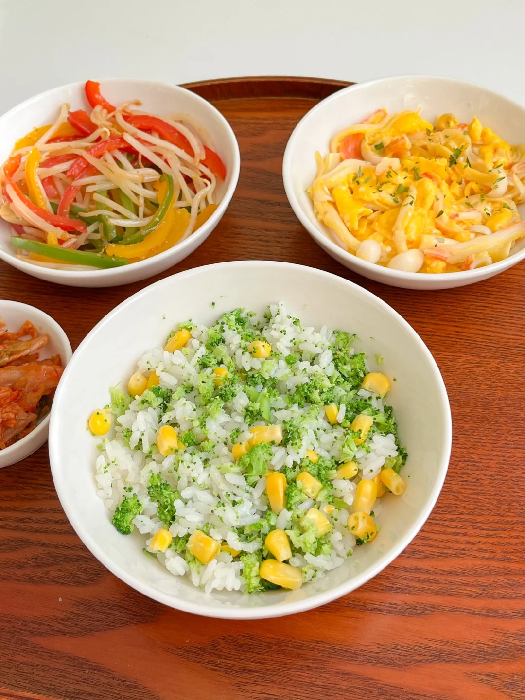 西兰花加盐焯水,切碎了和玉米粒拌在米饭里,不喜欢吃西兰花可以试试这么做!吃不太出蔬菜的味道,还可以加点拌饭海苔[偷笑R]