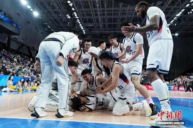 1月9日,2025-2026中国男子篮球职业联赛(CBA)常规赛,北京队主场85:87不敌山东队。图为山东队庆祝胜利。中新社记者张祥毅摄