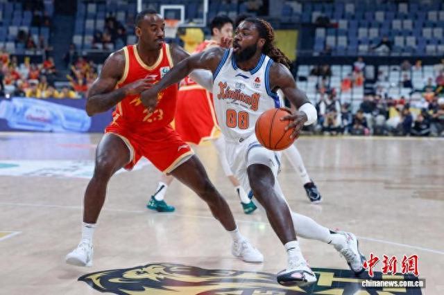 1月9日晚,2025-2026赛季中国男子篮球职业联赛(CBA)常规赛,广厦队以87:72战胜新疆队。图为新疆队球员哈里斯(右)在比赛中持球推进。中新社记者肖健摄