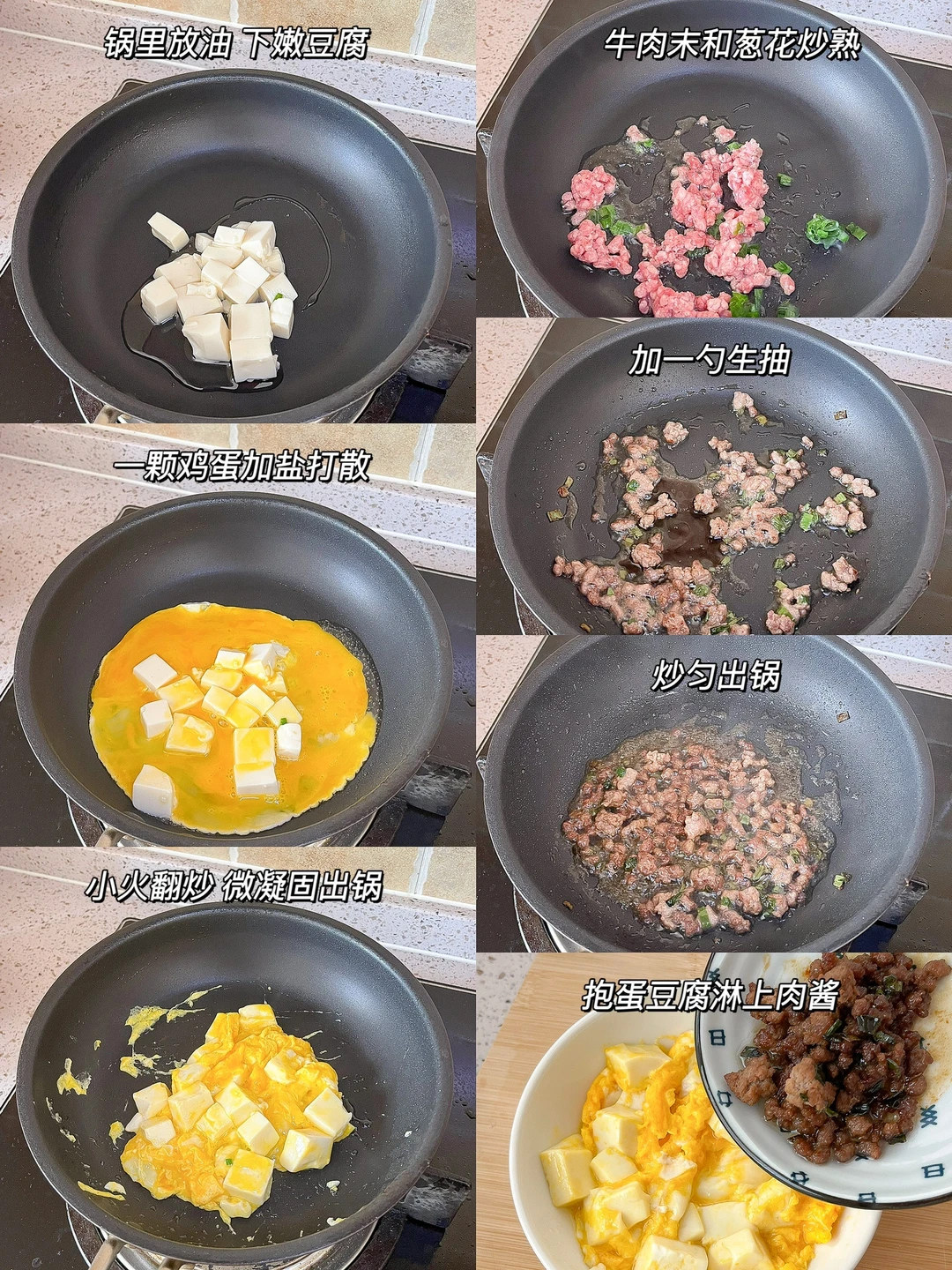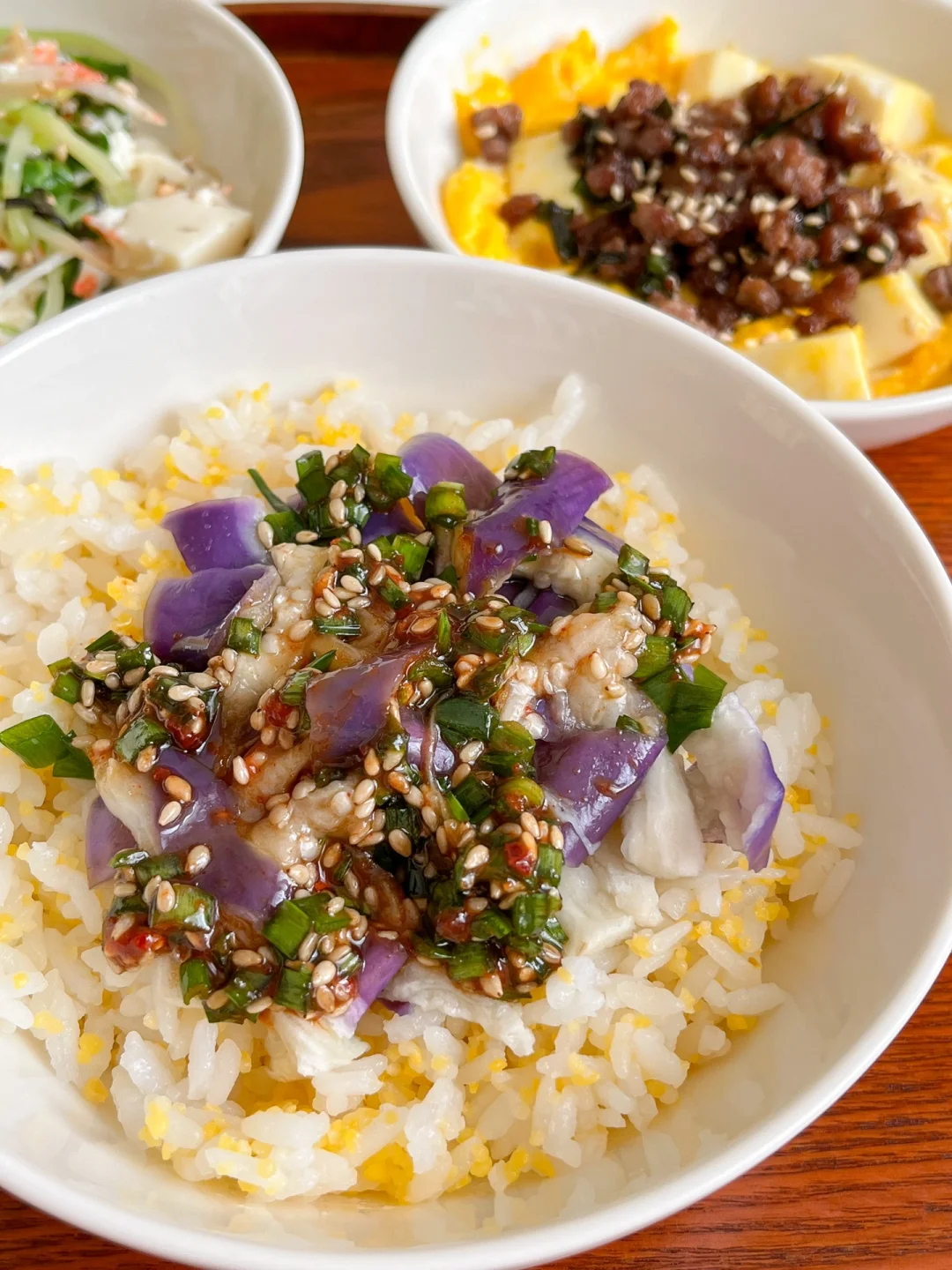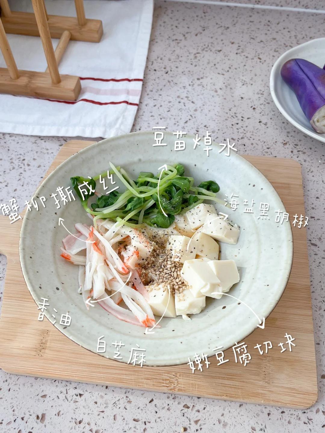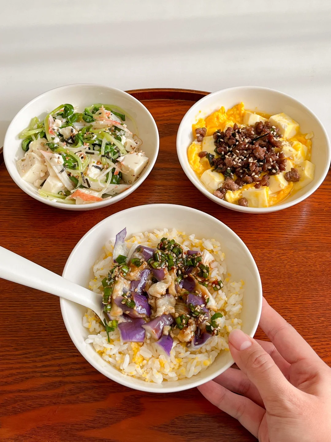 “鸡蛋和豆腐都是随手可得的食材,优质的蛋白质还便宜。今天中午就吃豆腐啦~安排上两道小菜,这样真的做太好吃!” 今日午餐: ¹蟹柳豆苗拌豆腐 ²肉末抱蛋豆腐 ³茄子饭