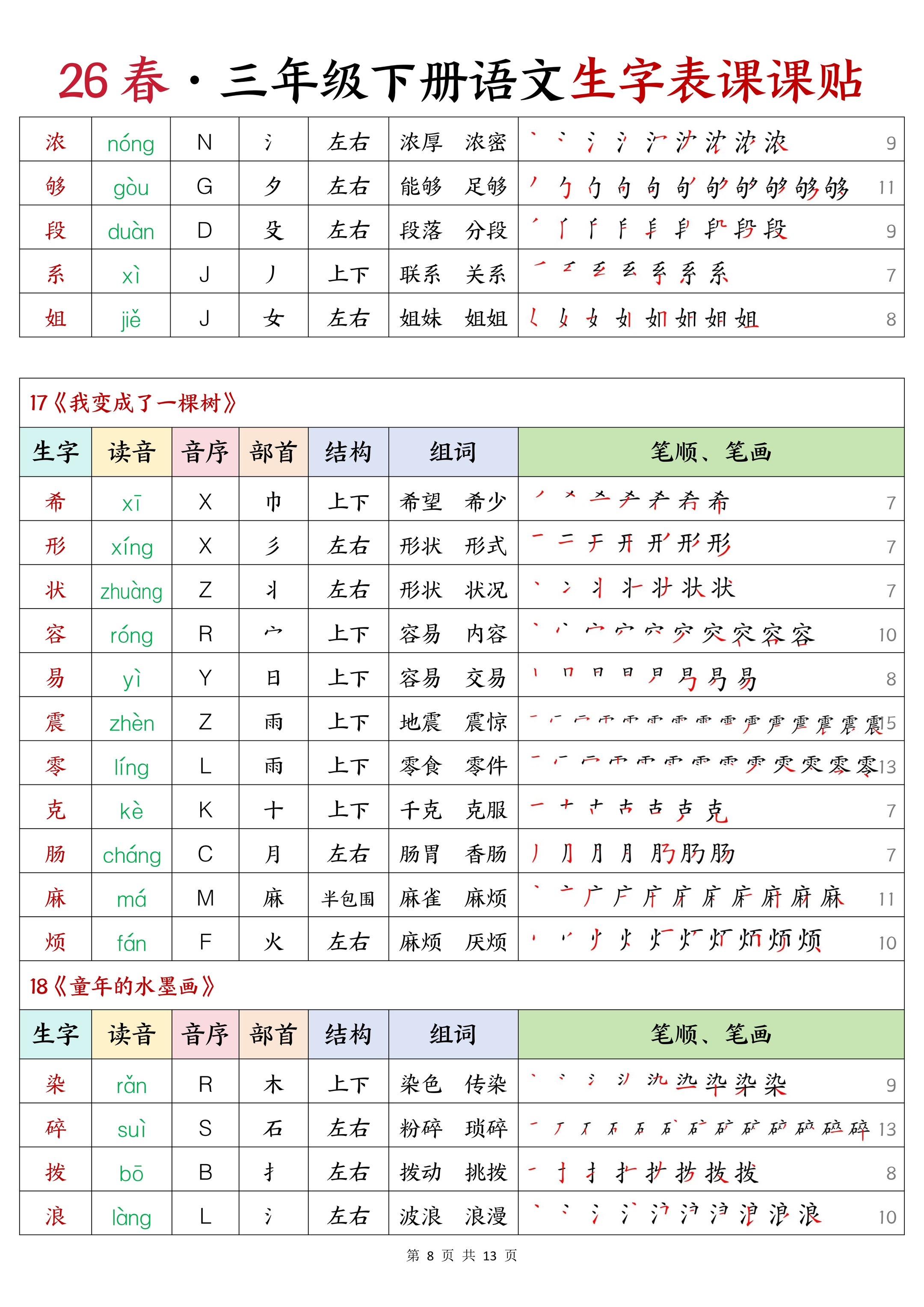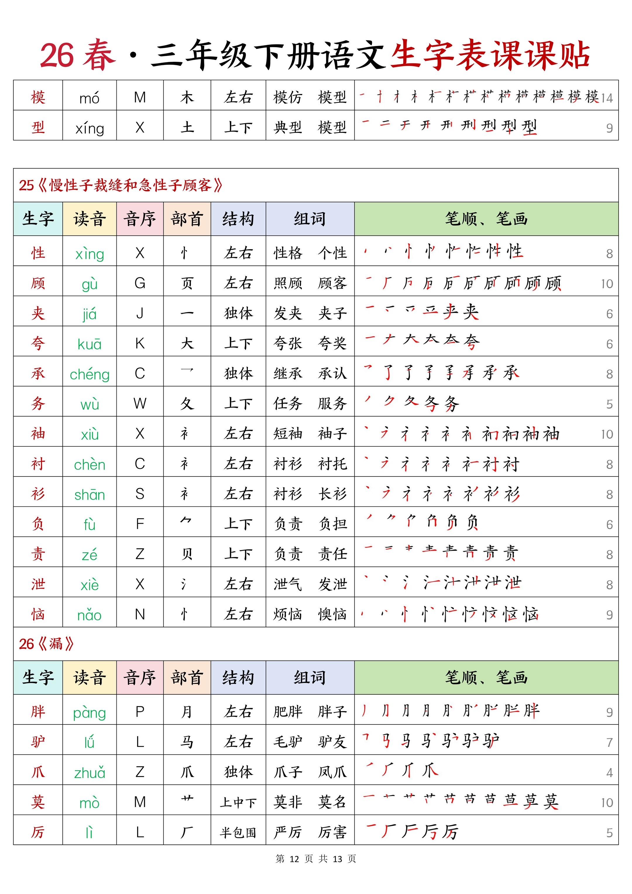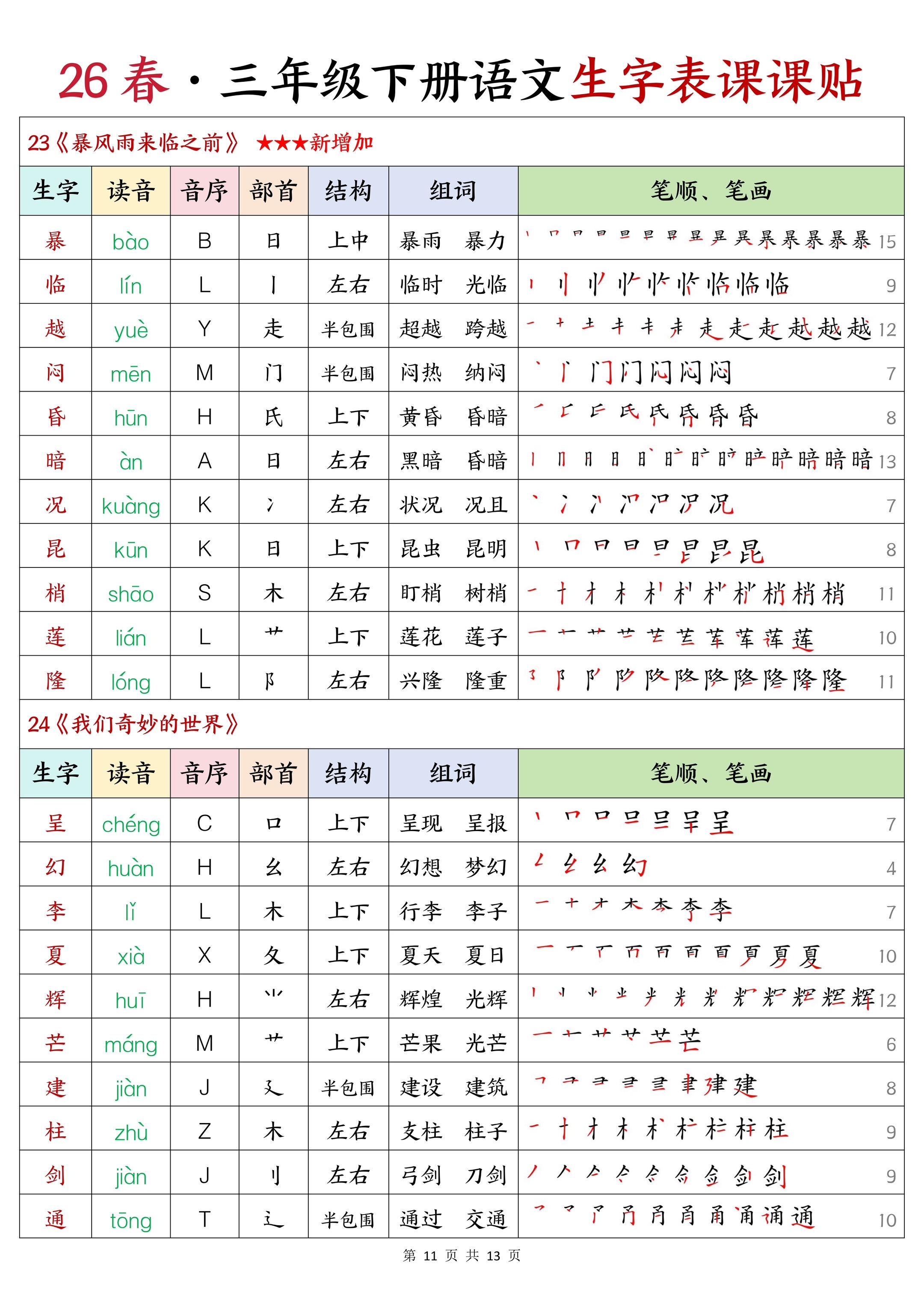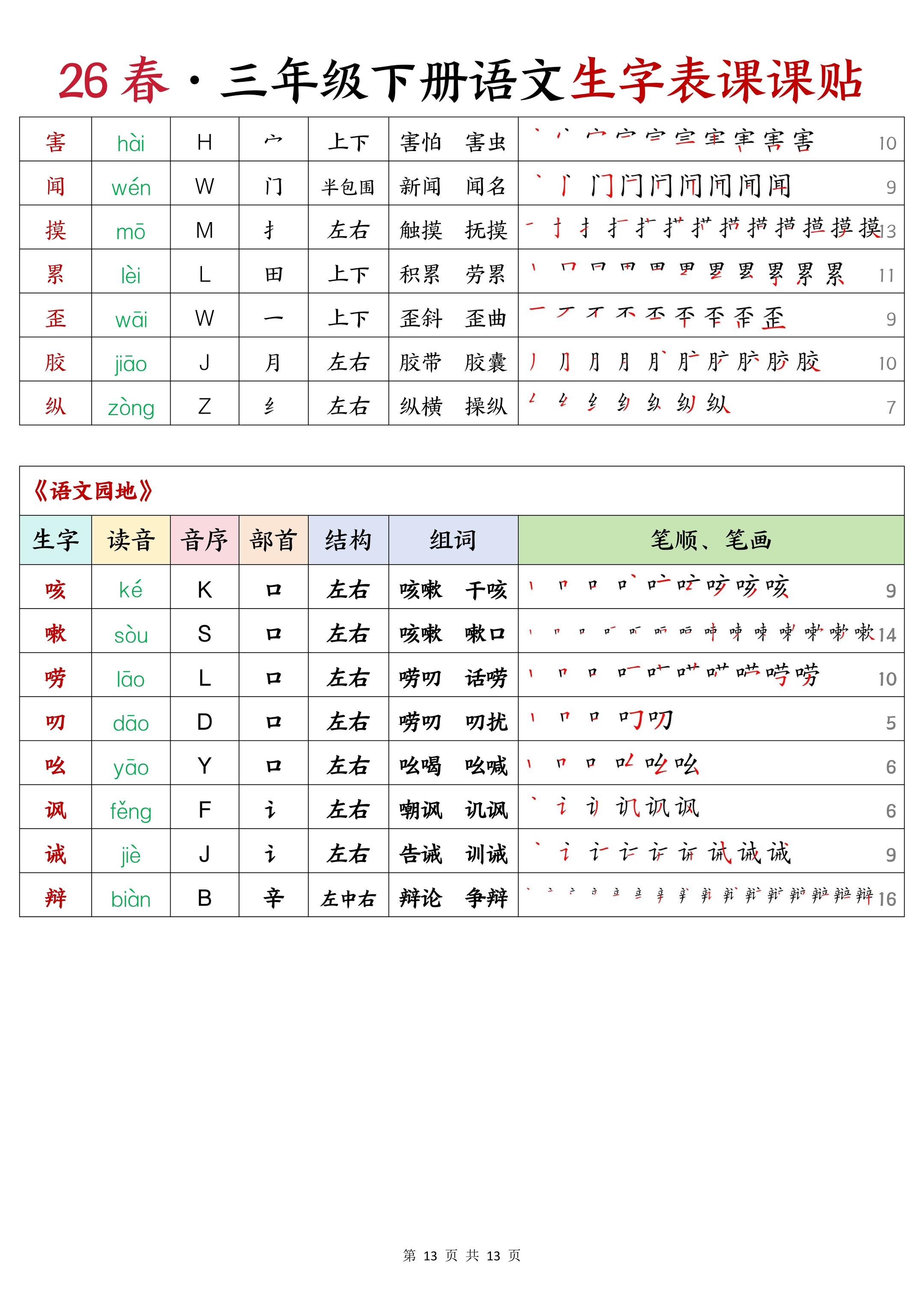 2026年春小学三年级语文下册生字帖课贴。生字词 注音,笔画。写作干货 永春县最便宜打印店 八方文印店,有需要可以自行保存打印