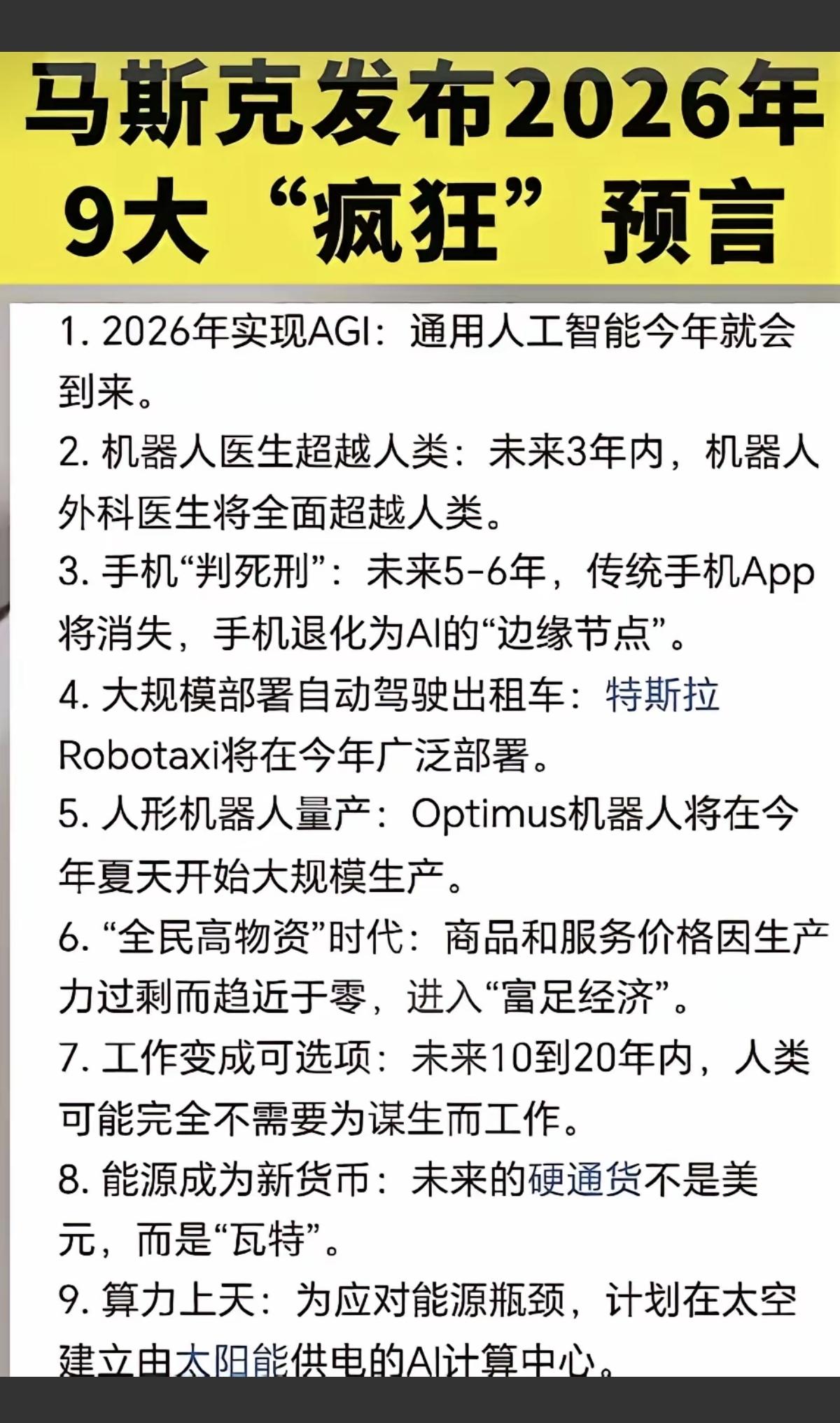 马斯克 发布2026年:九大预言! 涉及人工智能,AI,机器人,算力,经济,能