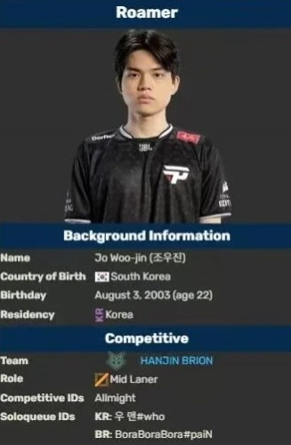 直播吧1月12日讯韩服又涌现一个以92%胜率冲上韩服第六的选手,曾被质疑是AI,但随后被扒出是BRO的替补中单Roamer,该选手03年出生;