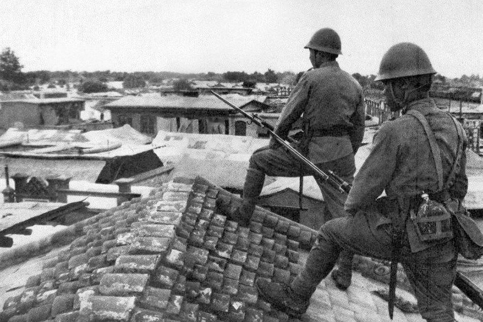 1937年7月,卢沟桥事变爆发后不久的战场一角,两名日军士兵爬上宛平城附近民房屋顶,背对镜头,钢盔在阳光下泛着冷光,手中三八式步枪斜指前方,姿态警戒而紧张。屋顶瓦片斑驳破碎,远方是连绵的低矮民房与稀疏树影,整个画面透着战争初期的压抑与肃杀。 卢沟桥事变爆发后,日军迅速控制部分区域,为防止中国守军(29军)反击或狙击,常派士兵爬上高点进行火力压制。照片中日军的姿势是标准屋顶警戒姿势,既降低自身暴露,又便于观察与射击。