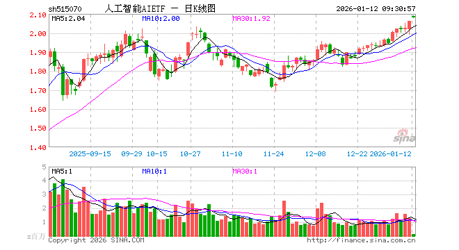 1月12日,人工智能AIETF(515070)开盘涨1.41%,报2.089元。人工智能AIETF(515070)重仓股方面,新易盛开盘跌3.07%,中际旭创跌2.26%,寒武纪涨2.91%,澜起科技涨1.34%,中科曙光涨0.32%,科大讯飞涨3.42%,豪威集团涨0.01%,海康威视涨0.79%,浪潮信息涨0.67%,金山办公涨2.49%。