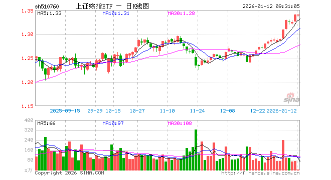 1月12日,上证综指ETF(510760)开盘跌0.15%,报1.338元。上证综指ETF(510760)重仓股方面,农业银行开盘跌0.40%,工商银行跌0.13%,贵州茅台涨0.00%,中国石油跌0.20%,招商银行涨0.00%,工业富联涨0.02%,中国人寿跌0.16%,寒武纪涨2.91%,中国银行跌0.36%,中国平安跌0.14%。