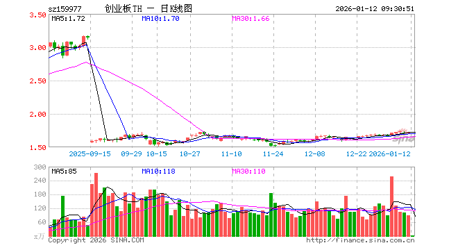 1月12日,创业板ETF天弘(159977)开盘跌0.17%,报1.725元。创业板ETF天弘(159977)重仓股方面,宁德时代开盘跌0.33%,中际旭创跌2.26%,东方财富跌0.29%,新易盛跌3.07%,阳光电源跌2.23%,胜宏科技跌2.00%,汇川技术涨1.07%,迈瑞医疗涨0.53%,亿纬锂能跌1.07%,温氏股份涨0.00%。