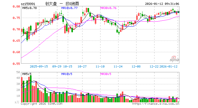 1月12日,创大盘ETF(159991)开盘涨0.00%,报0.775元。创大盘ETF(159991)重仓股方面,宁德时代开盘跌0.33%,中际旭创跌2.26%,东方财富跌0.29%,新易盛跌3.07%,阳光电源跌2.23%,胜宏科技跌2.00%,汇川技术涨1.07%,迈瑞医疗涨0.53%,亿纬锂能跌1.07%,同花顺涨0.73%。