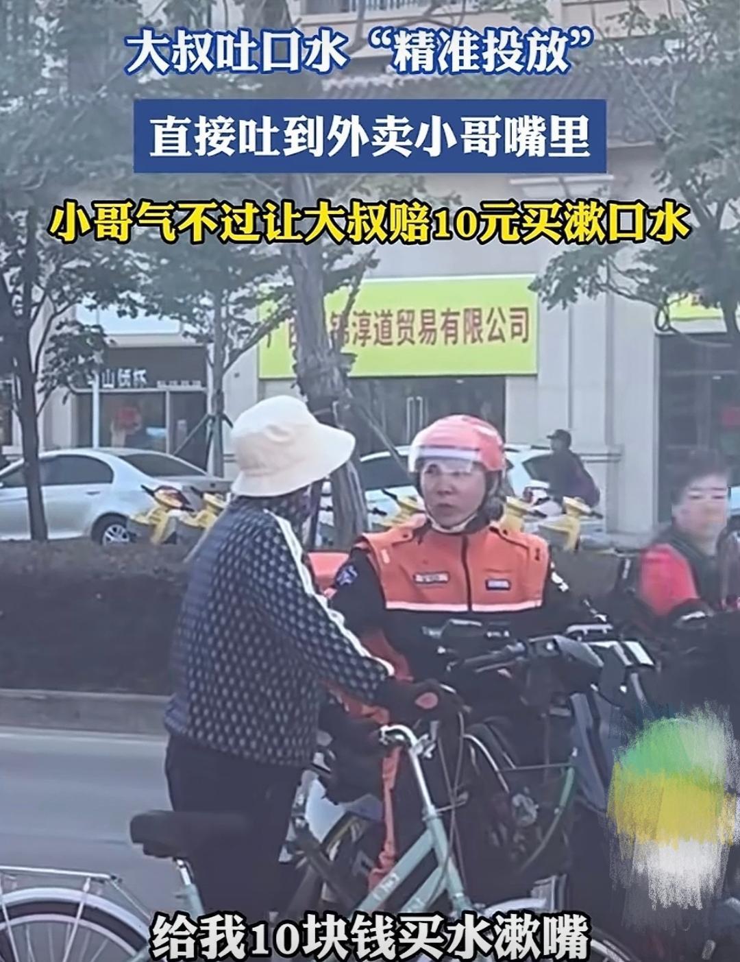 救命啊!我快被笑死了! 外卖小哥骑车送餐路上,竟被天降“暴击”恶心到原地裂开,这事可真不敢细想。 某地街头,一大叔骑着自行车在前,外卖小哥骑着电瓶车在后。正当小哥要超车时,大叔歪着头一口浓痰直接飞出去。好巧不巧,这口痰正好飞进小哥的嘴里! 这可把小哥给恶心坏了,他一边吐一边擦嘴,怒气之下他追上去把大叔拦下想讨个说法:“你不看着点人吗?吐痰都吐到我嘴里了”。 大叔一开始还有点懵,反应过来后赶紧赔笑说不好意思。小哥不解气:光道歉不行,你得给我十块钱买瓶漱口水涮涮,太恶心了! 大叔算是拎得清的人,知道自己理亏,赶忙掏出手机麻溜的转了过去。小哥收到钱后也没再继续闹下去,骑着车就走了,估计是急着找地方漱口。 这事算是了了,可网友们都笑翻了: “大叔这口痰,能让小哥三天吃不下饭”。 “小哥恐怕有心理阴影了,以后看见骑车的先躲三米远!” “这口痰的幽门螺杆菌估计都爆表了吧!” 虽然都是些玩笑,但还是希望大家都能改掉随地吐痰的习惯。出门在外如果都讲究点公共卫生,也不至于发生这么离谱的事。 总之,这位小哥算是倒了八辈子血霉,既让人心疼又觉得很好笑!