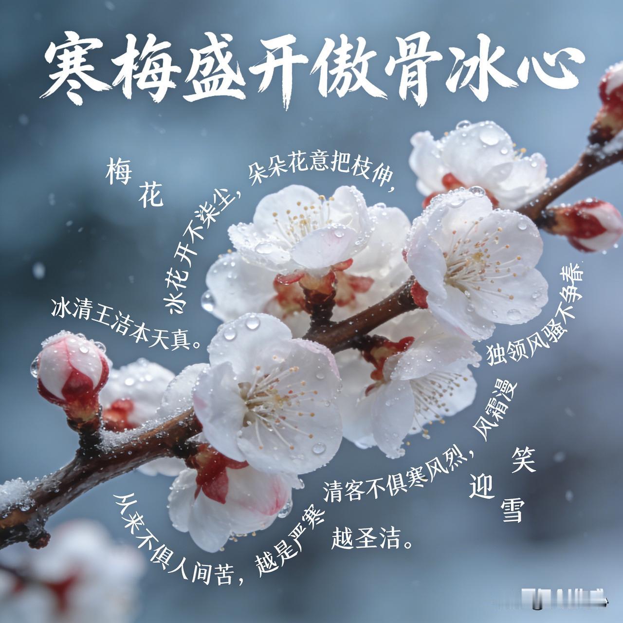 《寒梅盛开傲骨冰心》乐韵诗心原创诗词: 梅花无意把枝伸, 朵朵花开不染尘。 冰清玉洁本天真, 独领风骚不争春。 清客不惧寒风烈, 风霜漫天笑迎雪。 从来不惧人间苦, 越是严寒越圣洁。 这首诗词借梅花咏志,赞其品性高洁:梅花不刻意伸展枝条,花朵洁净无染,冰清玉洁出于本真,虽独占风情却不与春花争艳。作为"清客",它不惧凛冽寒风,笑对漫天风雪,从不畏惧人间苦难,越是严寒,越显圣洁。全诗以梅喻人,歌颂不媚俗、不畏难、坚守本心的高尚品格。