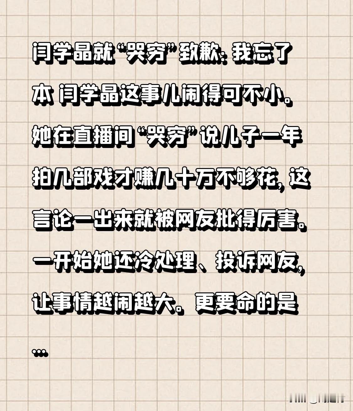 闫学晶就“哭穷”致歉:我忘了本 闫学晶就“哭穷”致歉:我忘了本 闫学晶此次事件闹得沸沸扬扬。她在直播间“哭穷”,称儿子一年拍几部戏才赚几十万,根本不够花。此言一出,便遭到网友严厉批评。起初,她采取冷处理方式,甚至投诉网友,致使事态愈发严重。 更糟糕的是,儿子卷入中戏“新疆班”入学资格风波,所幸中戏回应称其儿子并未进入新疆班。11日晚,闫学晶终于在朋友圈致歉,称自己忘了本,讨厌轻视大众的自己。 明星应有明星的觉悟,言行需接地气,切勿高高在上地“哭穷”,否则极易翻车,事业也会受影响。希望她日后能谨言慎行。 闫学晶演唱会