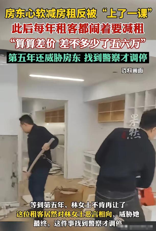 “这就是人性”!浙江杭州,女房东看到租客生意不好,家里还有人生病,于是心一软,当年给租客减免了15000元房租。没想到,租客不仅不知道感恩,反而每年都闹着要减房租,四年下来,女房东给减免了五六万。第五年,女房东不肯再减免房租,可谁知租客竟直接对她恶语相向,甚至还威胁她。女房东实在没办法,这才选择了报警。   林女士并非家境优渥的闲散之人,名下的临街商铺是她辛苦打拼所得,每月要承担房贷、物业费等固定开支,这份租金对她而言,是维持生活的重要支撑。   而租客最初找上门时,给人的印象是老实本分,看着商铺周边不错的人流量,双方很快敲定了每年十几万的租金,签订合同后开启了一段融洽的租赁关系。   最初的几个月里,租客按时交租,偶尔还会与林女士闲聊致谢,谁也没料到,这份平和会被后续的贪婪打破。   转折发生在租客开业不久后,恰逢生意淡季,叠加家中老母亲重病住院,巨额的医疗开支让他捉襟见肘。   走投无路的租客找到林女士,情绪激动地诉说困境,言语间满是无助,甚至红了眼眶。   同为普通人,林女士深知在外打拼的艰难,更见不得这般窘迫场景,没与家人过多商量,便主动提出当年减免15000元房租,帮对方渡过难关。   这份突如其来的善意让租客感激涕零,不仅当场连连保证,还特意拎着水果礼盒上门道谢,承诺等生意好转就把减免的租金补回来。   彼时的林女士,只觉得与人方便便是与己方便,从未想过要什么回报,更没预料到这一次心软会成为四年麻烦的开端。   善意的闸门一旦打开,便成了租客得寸进尺的突破口。   从第二年开始,每到交租前夕,租客总会准时找上门,哭穷卖惨的套路一成不变,借口却逐年翻新,从食材涨价、客流量少,到店铺装修缺钱、孩子上学交学费,花样百出。   林女士性子偏软,看着对方摆出的可怜姿态,总不忍心强硬拒绝,一次次妥协退让。   可她的善意没能换来感恩,反而让租客越发得寸进尺,减租的要求一年比一年高。   反观林女士,看着周边邻居的商铺租金逐年上涨,自己不仅分文未涨,还持续减免,心里的落差越来越大。   四年时间里,累计减免的房租竟达五六万元,这笔钱都是她省吃俭用攒下的血汗钱。   第五年,林女士明显感觉到自己的生活压力大了起来,家里各项开支都在增加,手头越来越紧张。   而租客的生活早就有了起色,家人的病情稳定了,小吃生意也步入了正轨。   林女士以为,这次租客应该不会再提减免的事了,可对方还是像往年一样找上门,张口就要求减租。   这一次,林女士没有犹豫,跟租客说清楚了自己的难处,明确表示这一年不能再减免,必须按合同交租。   被拒绝的租客瞬间撕下了伪装,此前的温顺与可怜荡然无存,取而代之的是满脸的戾气。   他指着林女士的鼻子恶语相向,甚至辱骂她是“老太婆”,指责她不近人情、为富不仁。   更过分的是,租客还放下狠话,威胁要赖在商铺里不走,甚至要去林女士家里闹事,让她的商铺不得安宁。   突如其来的变脸让林女士又气又怕,她尝试沟通辩解,可租客根本不听,依旧不依不饶地纠缠,严重影响了她的正常生活。   被逼无奈之下,林女士终于放弃了妥协,拿出手机报了警。   不得不说,林女士的善意值得肯定,可她无底线的妥协退让,也让这份善意成了被拿捏的软肋。   租客的行为则令人不齿,把别人的情分当成本分,把他人的善意当成可以无限索取的筹码,一旦无法满足便翻脸无情,这样的做法不仅寒了人心,也触碰了法律的底线。   在这场善意与贪婪的博弈中,我们清晰地看到,善良从来都不是软弱的借口,共情也不该成为被绑架的理由,唯有守住善意的边界,明确权利与义务的底线,才能让人与人之间的相处回归真诚与平和。   今天的分享到这里就结束了,大家对此事有何看法,欢迎在评论区留言和讨论,感兴趣的可以点击头像加关注,我将每日更新优质内容,我们下期见。