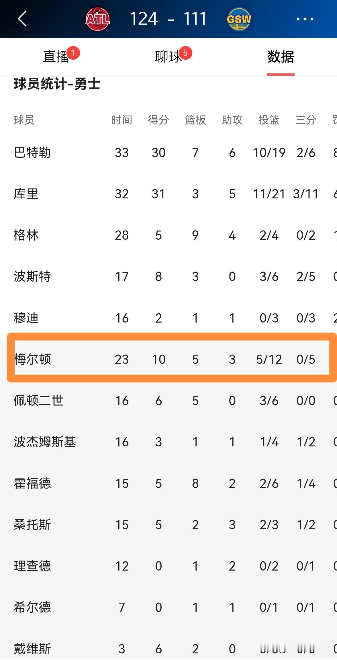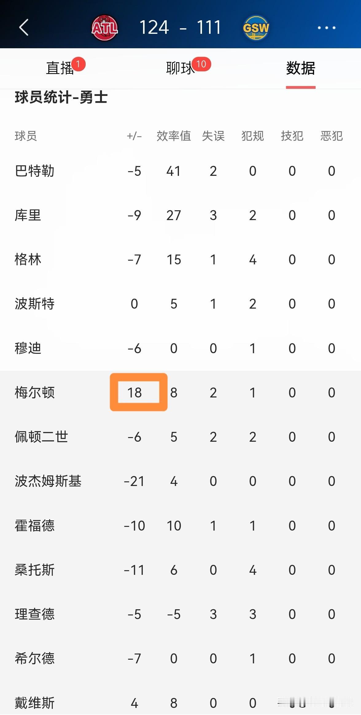 勇士大将梅尔顿真是特别的神奇!虽然今天勇士在主场以111:124不敌老鹰,但是让人感到特别意外的是,本场比赛梅尔顿的场上正负值竟然高达+18,高居全队第一。 整场比赛下来,梅尔顿替补出战23分钟,投篮12中5,其中三分球5中0、罚球1中0得到10分5篮板3助攻1抢断1盖帽,他的场上正负值为全队最高的+18。