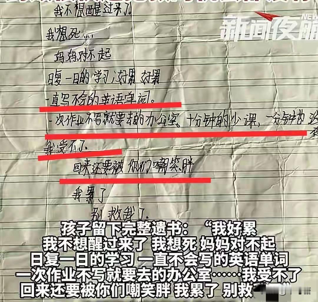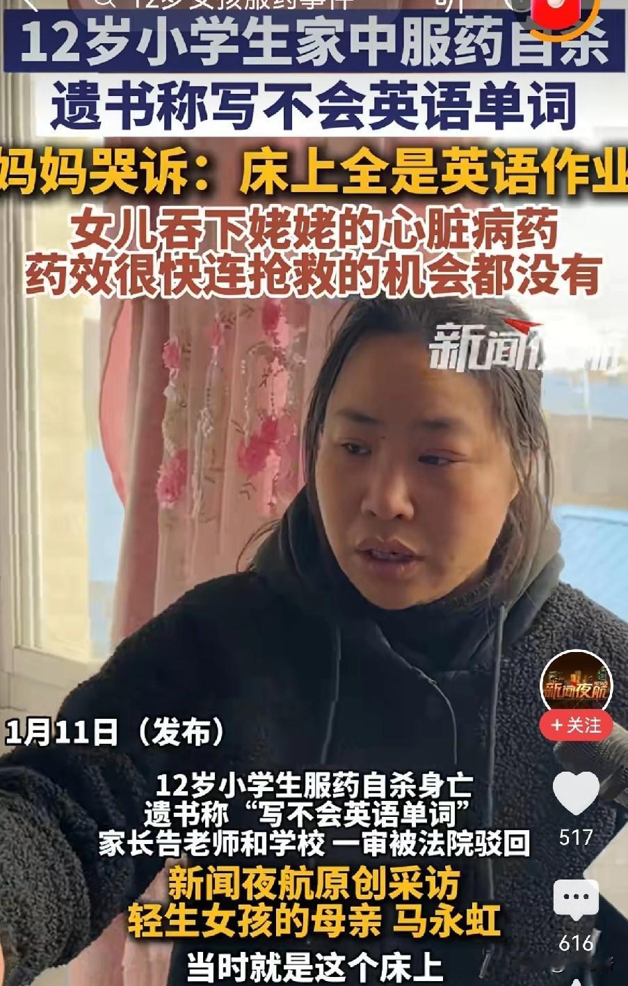 12岁女孩留遗书服药自尽,母亲把学校老师告上法庭!法院驳回后,真相刺痛无数家长。 江苏一个12岁的小姑娘,留下一张轻飘飘的遗书,就服了药,再也没醒过来。遗书里就一句话:“我太累了,我不会写英语单词。”孩子妈看到这话,当场就崩溃了,转头就把学校和英语老师告了,一口咬定是老师的错、学校的锅,非要讨个说法。 可法院一审直接驳回了她的诉求,说孩子的离世跟学校、老师没关系。这位妈妈不服气,案子又闹到了二审。 这边官司还没扯清楚,那边英语老师先扛不住了。她委屈啊!班里几十个孩子,都是一样的教法,怎么偏偏就这个孩子,因为学不会英语课文,就走上了绝路?这份委屈和压力,压得她直接辞了职。 真的是学校和老师的问题吗?恐怕所有人都被那句遗书骗了。这个姑娘是单亲家庭的孩子,平时看着懂事得让人心疼。她在作文里把妈妈写成闪闪发光的“女主角”,妈妈生病的时候,她会细心叮嘱注意身体;在学校里,还会主动照顾同学。 可谁能想到,这个笑着照顾所有人的孩子,心里早就堆满了乱七八糟的压力,快撑不住了。学不会的英语单词,只是压垮她的最后一根稻草。 还有身边人调侃她“胖”带来的外貌焦虑,单亲家庭里可能少了那么一点的情感支撑,没人听她说说心里话,没人问问她“累不累”,她总是一个人默默承担所有。 这件事值得所有人深思,孩子的世界是需要陪伴和倾诉的,但愿我们都能做一个能真正守护他们的父母。