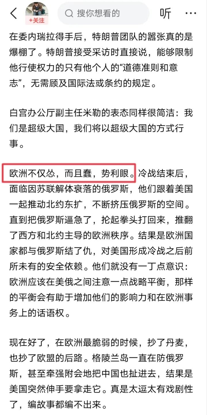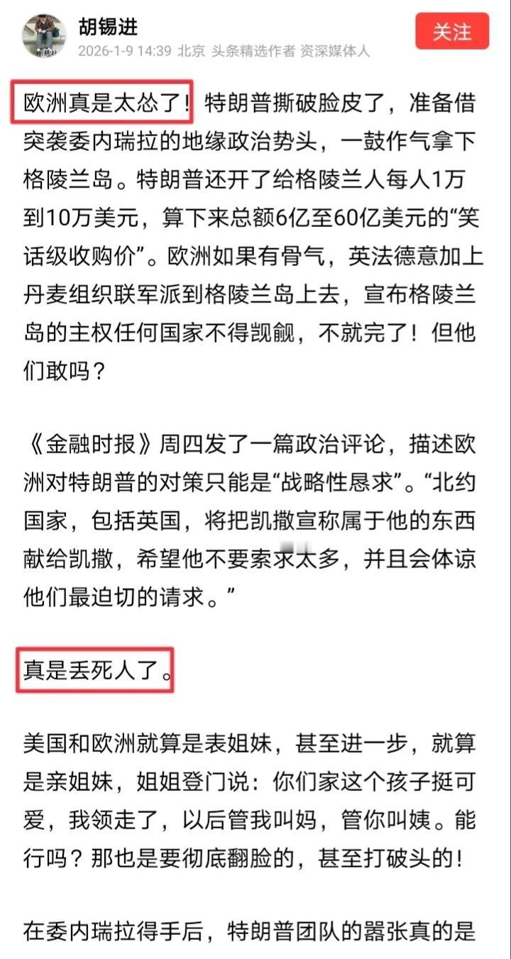 胡锡进近期火气有点大,又骂美国又骂欧洲,唯独不骂日本,这是怎么回事呢? 原来围绕美国收购格陵兰一事,胡锡进连续发文,老胡一边骂美国“不装了”、“连盟友都抢”,一边骂欧洲“太怂了”、“不仅怂,而且蠢,势利眼”。 相比之下,胡锡进对于磨刀霍霍的日本已经一个多月没放重话了。尤其是近期我们加强对日本的两用物项出口管制,日本方面过了一周仍然束手无策。老胡既不发文“不装了”谴责日方的军国行径,也没发文“太怂了”批评日方的黔驴技穷。 那么胡锡进对近期的日本事态反应迟钝,老胡是忘记日本了吗?