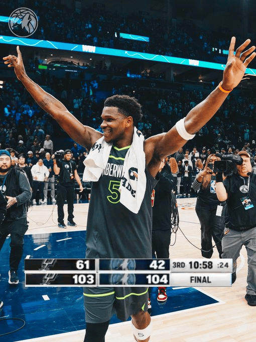 赛后,森林狼官方分享安东尼-爱德华兹赛场照,并附上最多落后19分的比分牌。