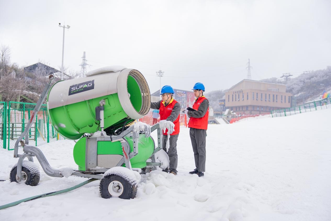 当地供电公司工作人员检查滑雪场造雪机的电力线路连接和安全用电情况