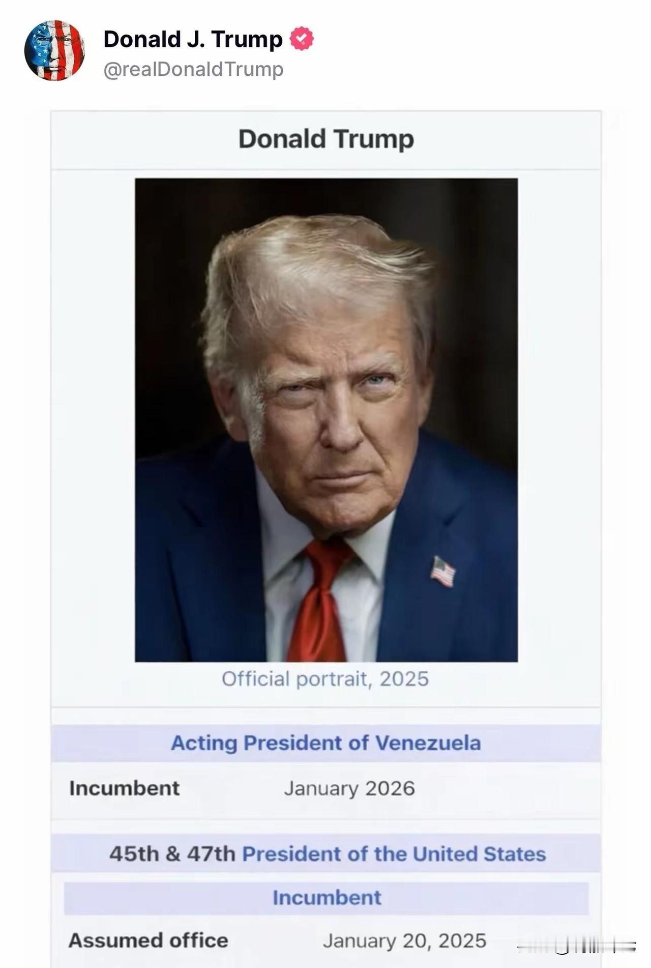 特朗普,正式委任自己担任委内瑞拉临时代理总统。委任方式很特别,那就是特朗普找到了张维基百科里面自己的介绍页,让人在上面加了一栏:“2026年1月,委内瑞拉代理总统”,然后,特朗普发了个“朋友圈”。 不知道为啥,总觉得特朗普精神状况有问题,比老拜登还有问题。老拜登只是反应迟钝:找不着北,转不过弯,爬不了梯,骑不了车……典型的老人症状。但特朗普不同,他始终处于亢奋状态,把自己想象得无比强大:刑法不管、宪法不管、国际法也不管……我行我素,好像自己就是宇宙之王。还有一点,贯穿了他的第一任期,那就是——无所不知的“懂王”,这很像某种“臆想人格分裂”症。 大家觉得呢?