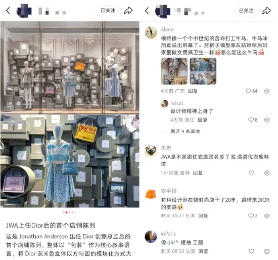 《贵圈》栏目注意到,今年1月,正好是Dior创意总监JonathanAnderson上任半年并带来其门店最新风格的时刻,迪奥在全球店铺的陈列也经历大幅变化,不少用户晒出照片引发讨论,全新的迪奥门店陈列中,既有模特像杂技演员一样平衡着迪奥的盒子,也有模特身着较为田园风格的服装在橱窗里张望,这种视觉风格在国内引起了用户讨论。