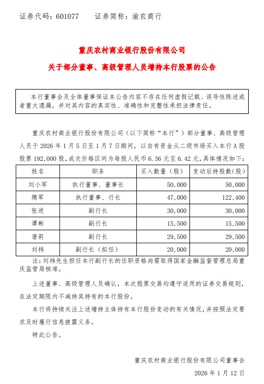 1月12日金融一线消息,渝农商行公告,部分董事及高级管理人员于2026年1月5日至1月7日以自有资金从二级市场合计增持本行A股股票19.2万股,成交价格区间为每股人民币6.36元至6.42元。其中,刘小军买入50000股,隋军买入47000股,张进买入30000股,谭彬买入15500股,唐莉买入29500股,刘祎买入20000股。上述人员确认在法定期限内不减持其持有股份,本行将持续关注并依法披露相关信息。