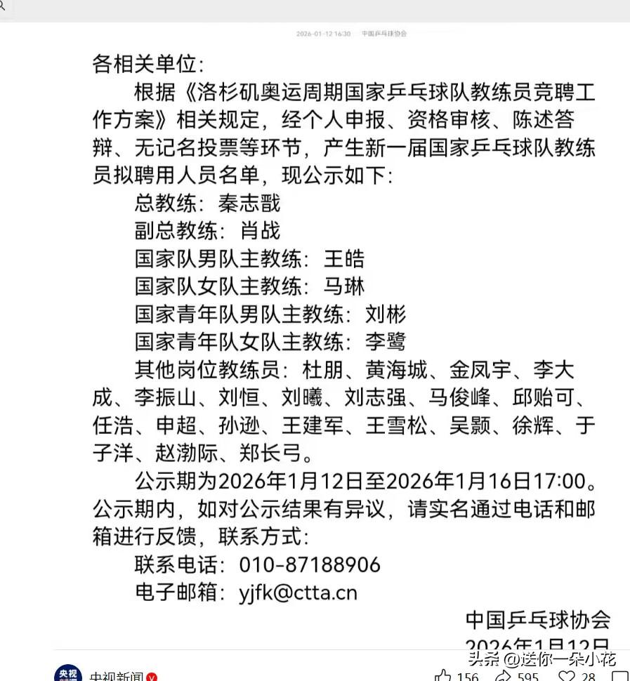 就在刚刚,已经猜测已久的国乒教练组最新名单终于公布了。但是队员分组还没公布。 1.秦志戬 总教练(前副总教练) 2.肖 战 副总教练 (前混双组长) 3.王 皓 男队主教练(维持不变) 4.马 琳 男队主教练(维持不变) 其他教练中包含大家比较熟悉的邱贻可,孙逊,刘志强,李大成,刘恒等等,还多了黄海成,于子洋。看来王楚钦和孙颖莎等主力的教练要在这些教练里面产生,静待。希望国乒继续在洛杉矶奥运会续写辉煌!国乒新任总教练 王楚钦