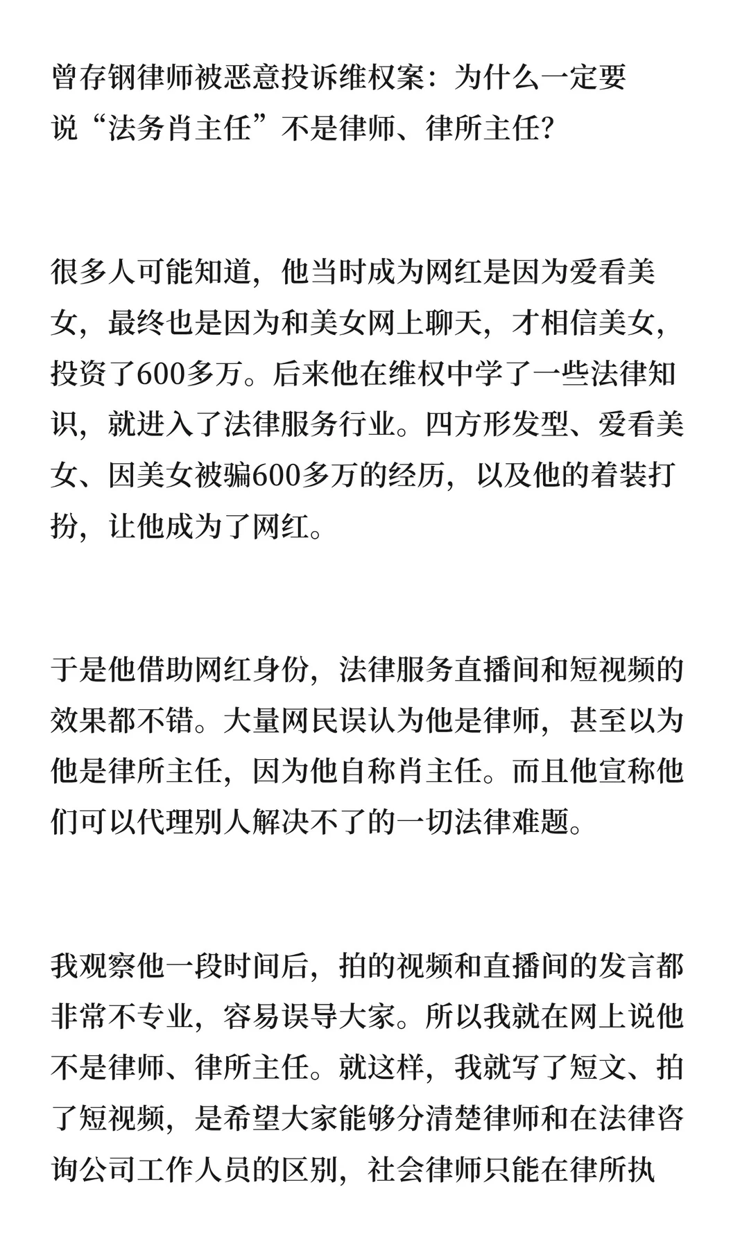 曾存钢律师因被恶意投诉维权,引发公众对“法务肖主任”身份的质疑。他通过网红身份推广法律服务,但其言行不专业,误导网民。我呼吁公众区分律师与法律咨询公司人员,提醒打官司应找正规律师,避免选择非专业人员。