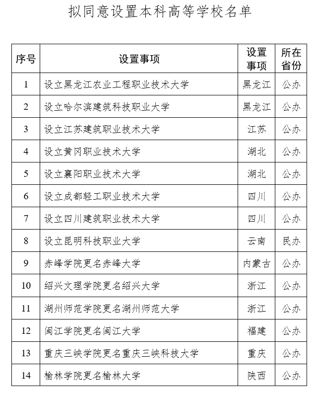 根据《中华人民共和国高等教育法》《普通高等学校设置暂行条例》《普通本科学校设置暂行规定》《本科层次职业学校设置标准(试行)》等有关规定,经教育部党组会议审议,拟同意设置黑龙江农业工程职业技术大学等14所学校,现予公示。