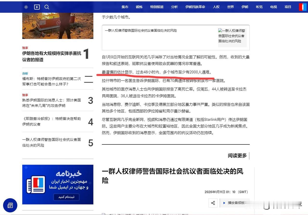 据iranintl网站1月11日报道,“最谨慎的估计显示,过去48小时内,多个城