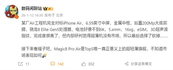 很多网友看到了曝光的配置信息非常遗憾,但也很理解取消的做法,毕竟连苹果都卖不动iPhoneAir超薄机型。