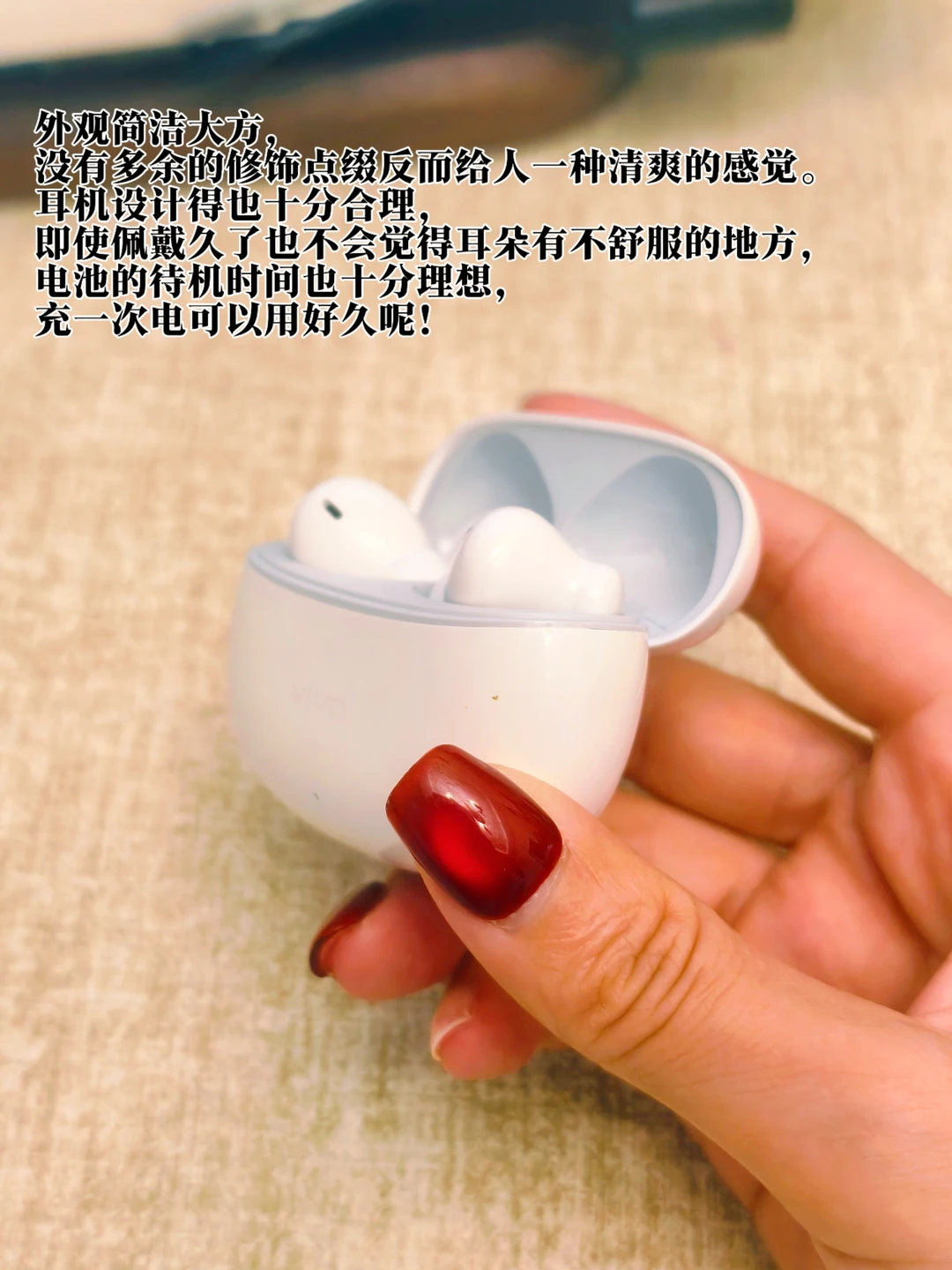 入手这款耳机是因为换了一台vivo的手机,许久没用过国产机,竟给了我超大的惊喜!刚好也想买一副蓝牙耳机,也就入手了vivo的这款。外观简洁大方,没有多余的修饰点缀反而给人一种清爽的感觉。耳机设计得也十分合理,即使佩戴久了也不会觉得耳朵有不舒服的地方,电池的待机时间也十分理想,充一次电可以用好久呢!