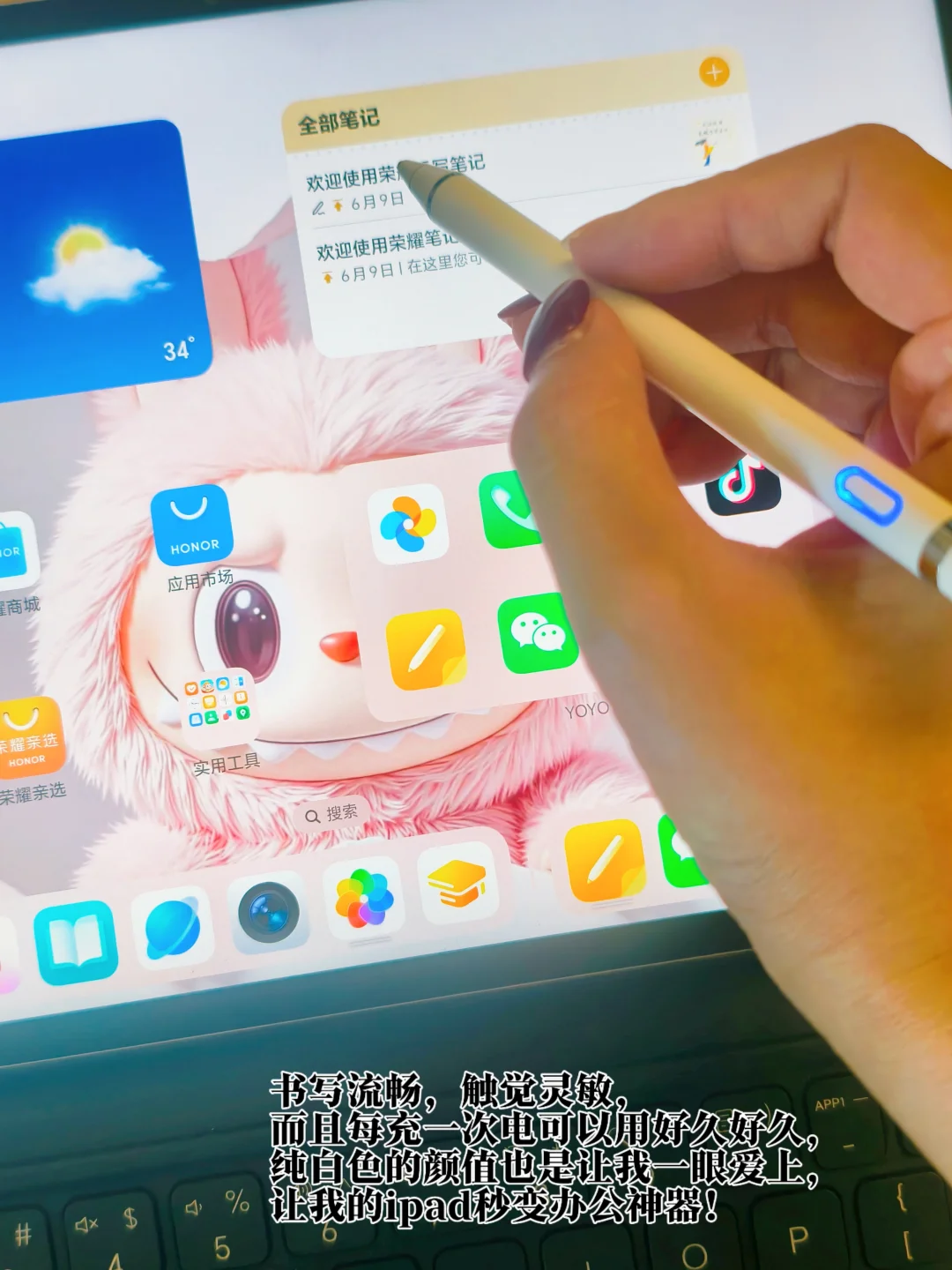 自从做自媒体以来,我总是习惯性地把自己的一些突然出现的想法或是在别处看到的很有感悟的句子在ipad上记录下来,比起一个字一个字地敲,这款手写笔简直就是来拯救我的神!书写流畅,触觉灵敏,而且每充一次电可以用好久好久,纯白色的颜值也是让我一眼爱上,让我的ipad秒变办公神器!