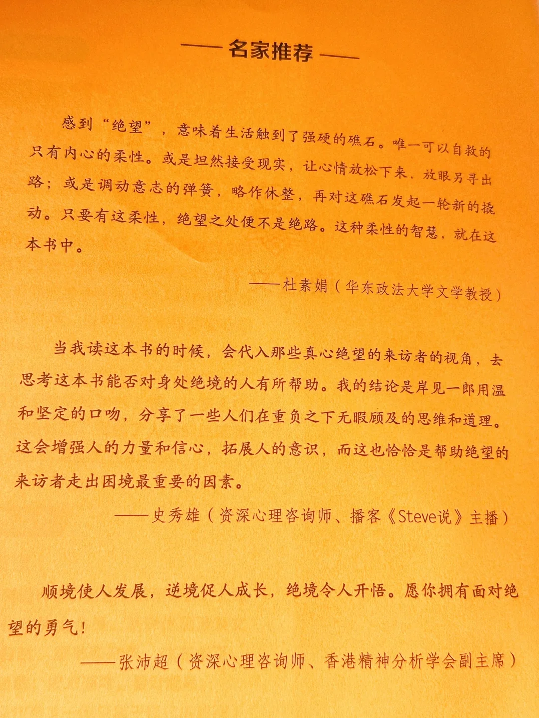 🔖这本《有时真的很绝望》是岸见一郎先生的最新力作。他在书中别出心裁地采用了与3位“绝望青年”对话的方式,一阵见血地指出了当代年轻人在事业、爱情、人际关系等方面陷入绝望的症结所在,并给出了一份切实可行的行动指南。
