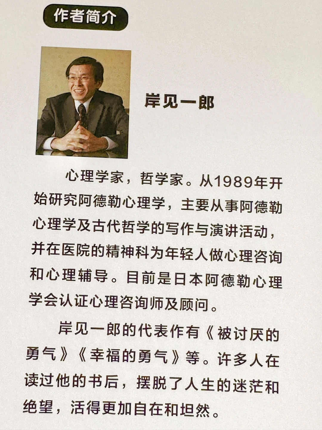 ✨认识岸见一郎,是从《被讨厌的勇气》开始的。真挚朴实的语言,实操性强的建议,一阵见血的剖析,读后令人醍醐灌顶,印象深刻。