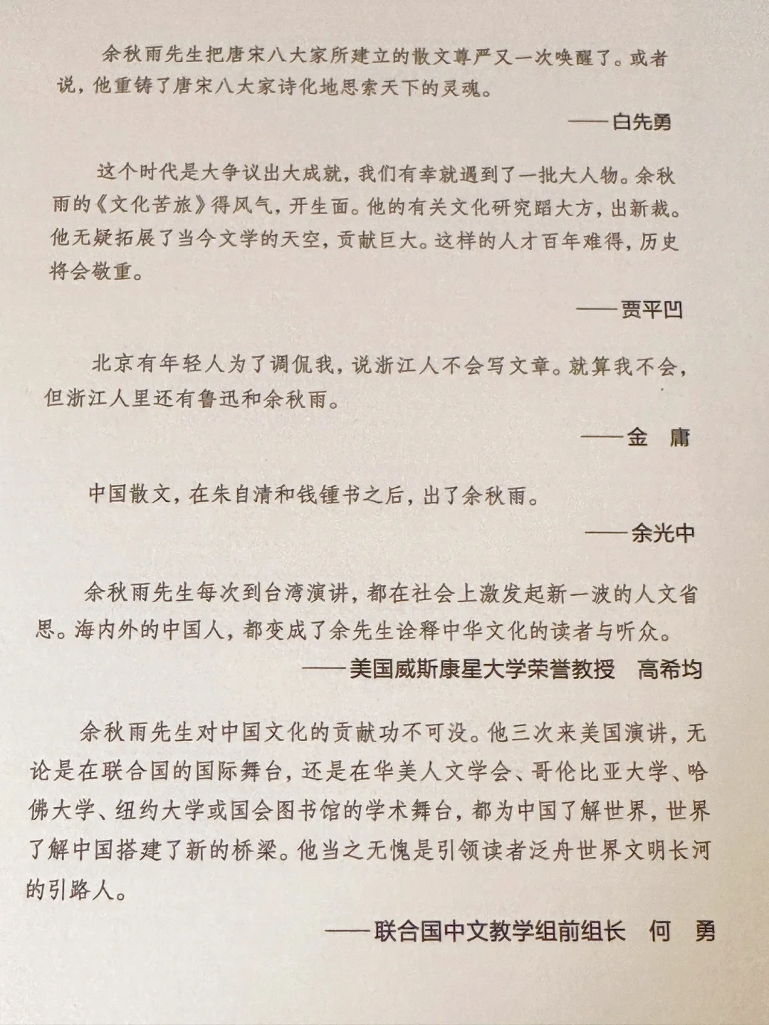 “余秋雨先生把唐宋八大家所建立的散文尊严又一次唤醒了。或者说,他重铸了唐宋八大家诗化地思索天下的灵魂。”