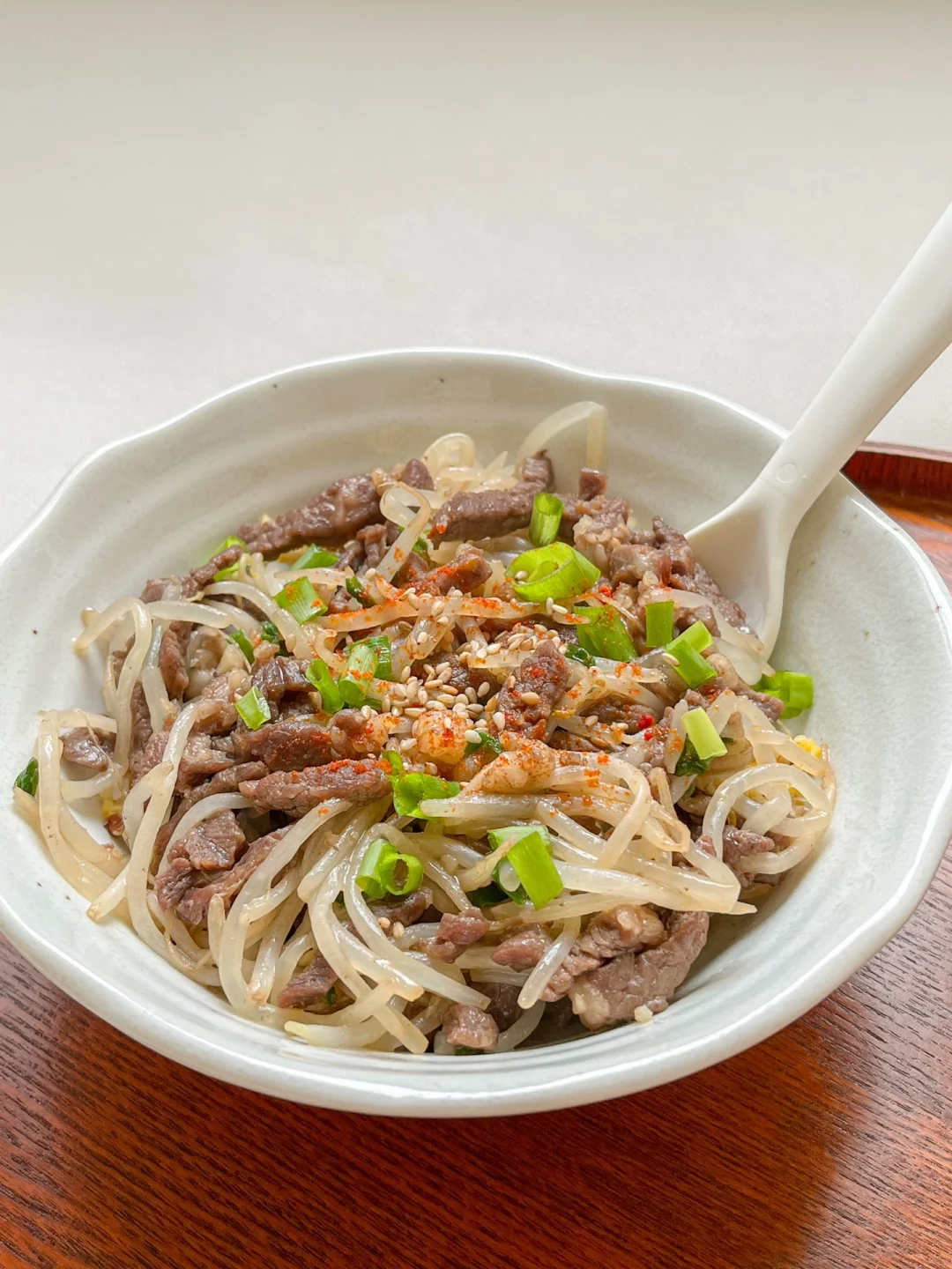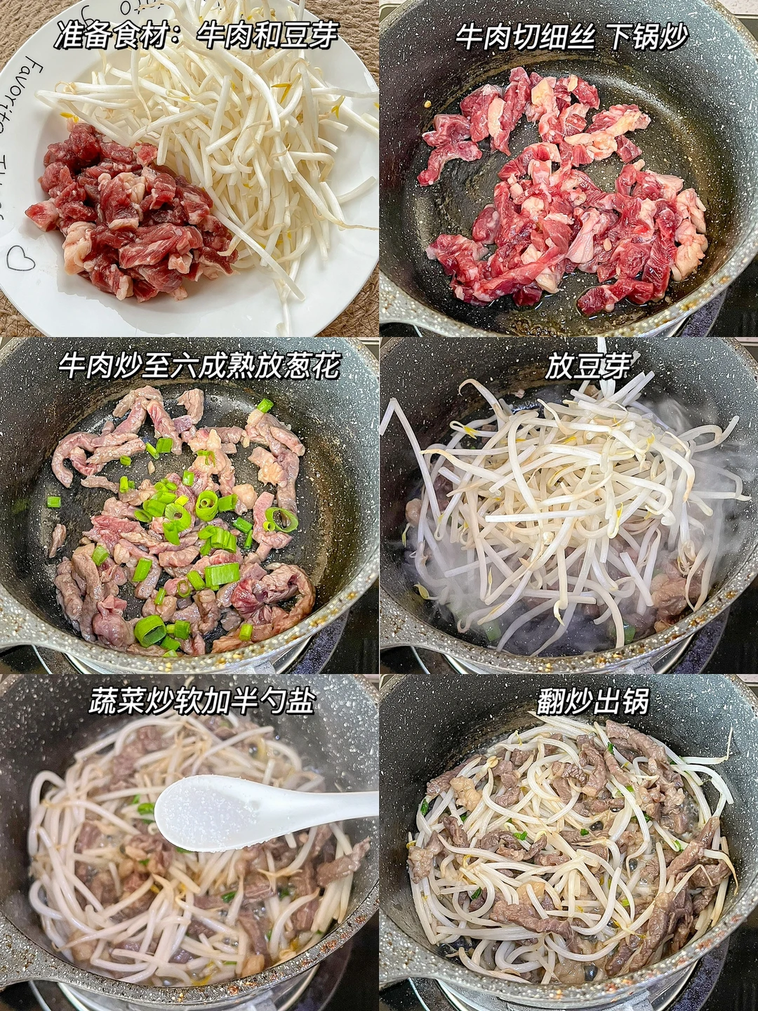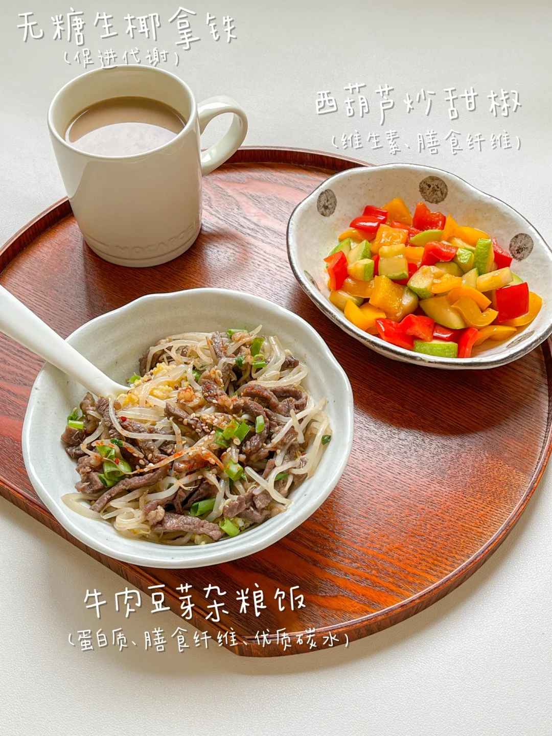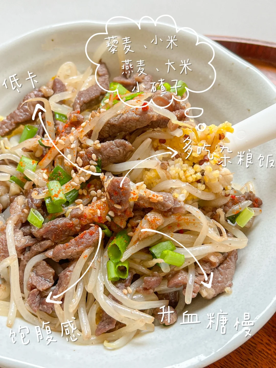 我用了一块80克的牛排,切细条炒到七分熟加豆芽和葱花炒熟。调味只放了盐和一点点辣椒粉。底下的主食是杂粮饭:大米、小米、藜麦、小碴子和燕麦。简单又低脂美味!