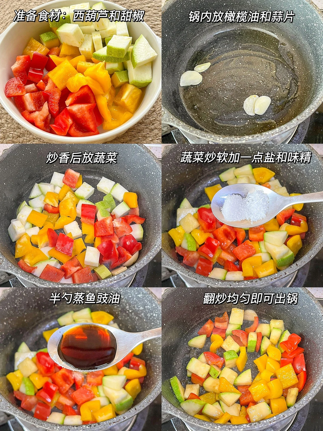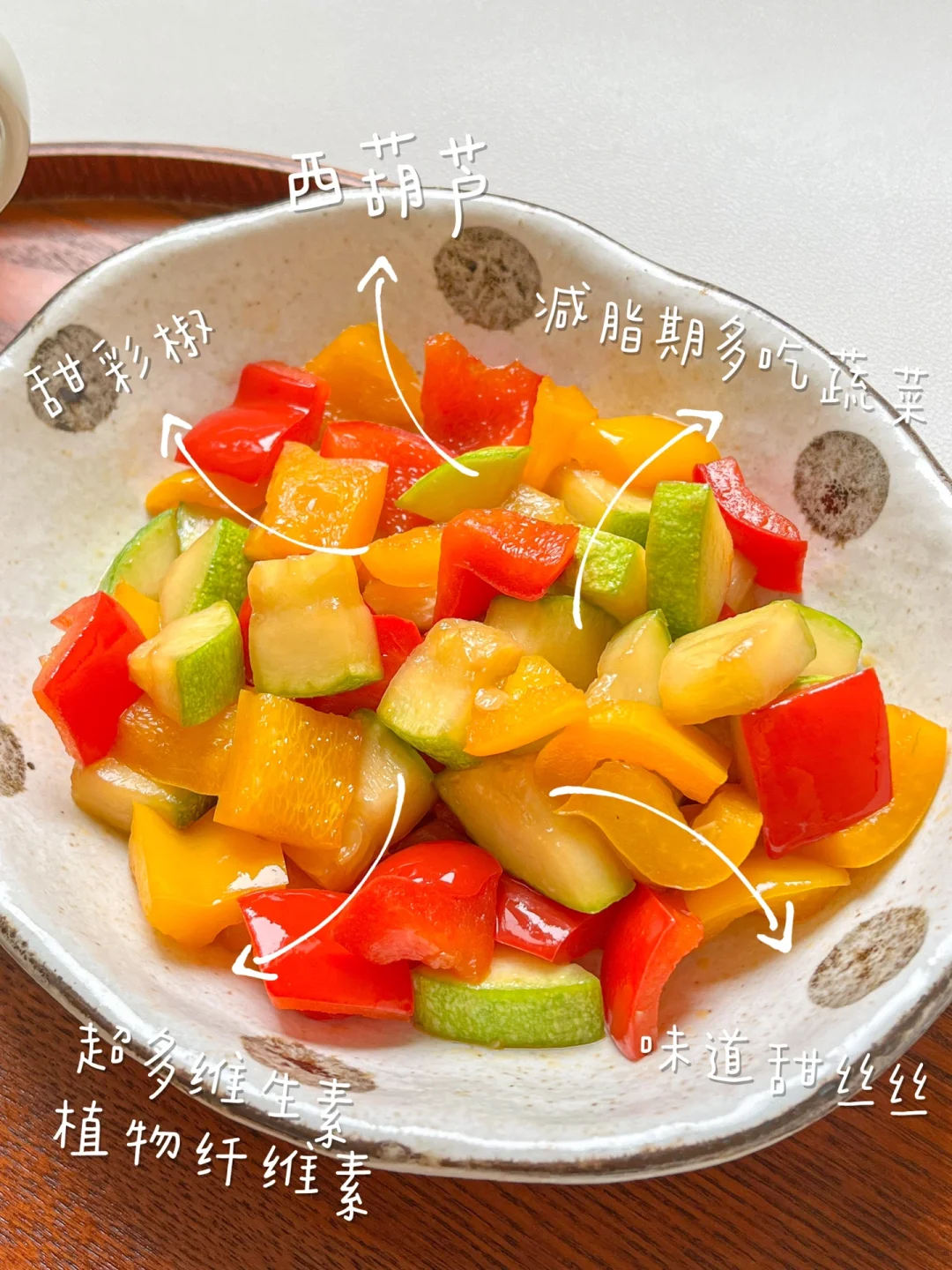 我真的很爱甜椒,炒熟以后就是甜丝丝的,还有丰富的维生素和膳食纤维。颜色好看,吃着也有食欲!甜椒和西葫芦都切成块,放橄榄油和蒜片,再倒入全部蔬菜一起炒,放一点盐和蒸鱼豉油就可以了。做出来炒鸡好看!多吃蔬菜,植物纤维可以帮助我们减脂的~