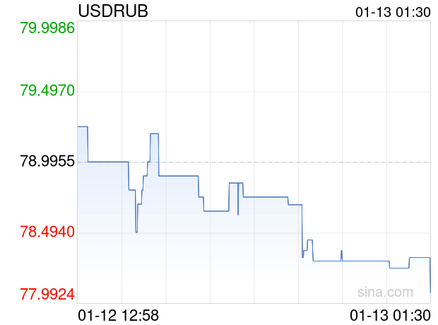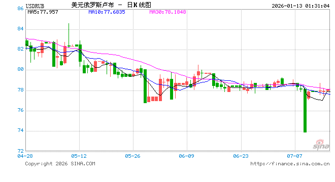 新浪外汇消息2026年01月13日,截至01时30分,外汇市场上美元兑俄罗斯卢布汇率跌破1美元兑换78.0705俄罗斯卢布。跌幅为-1.1709%