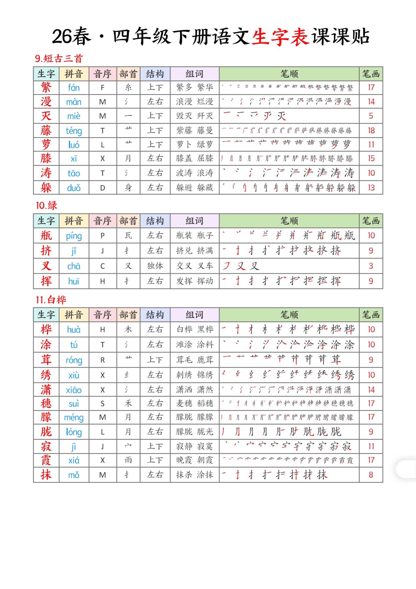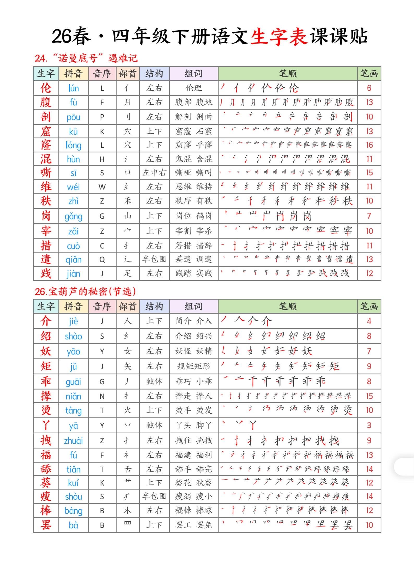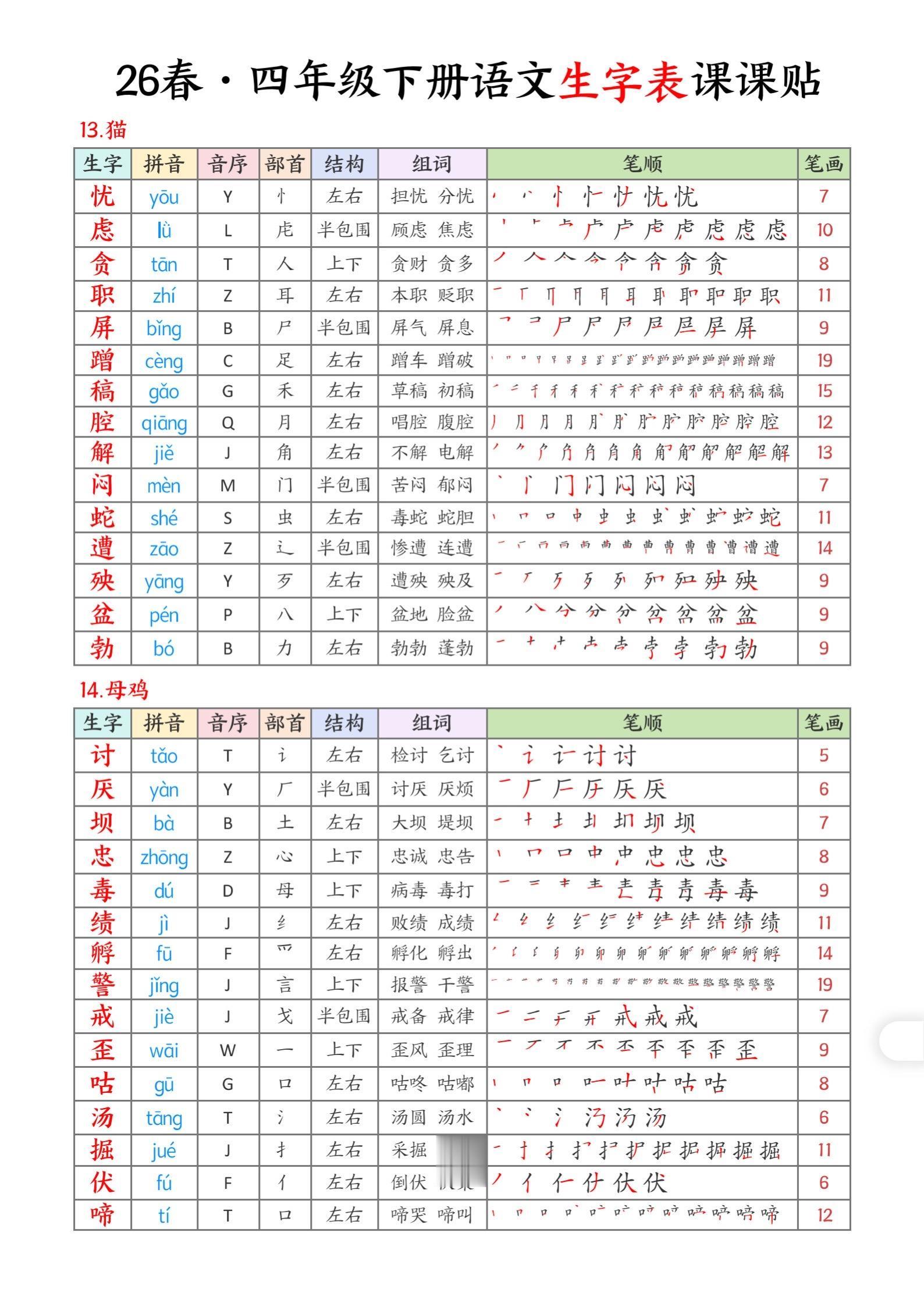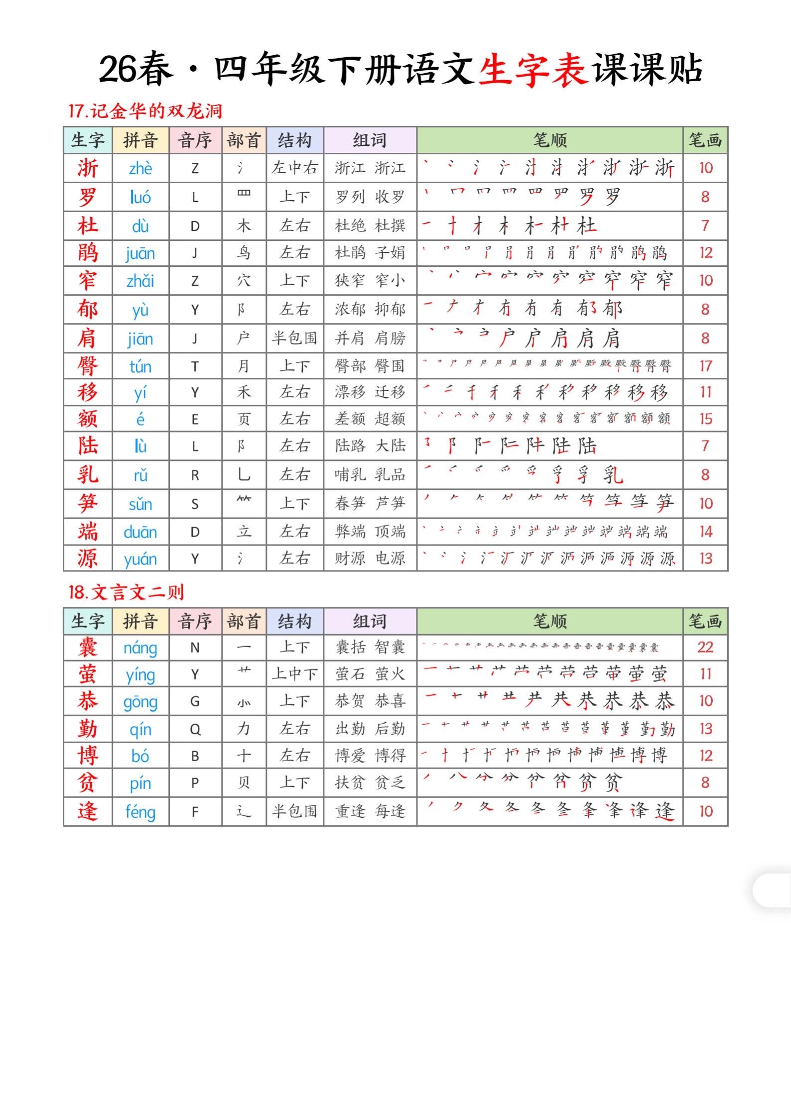 2026年春小学四年级语文下册生字帖课贴。坚持学习打卡 生字注音 生字帖 有需要可以自行保存打印