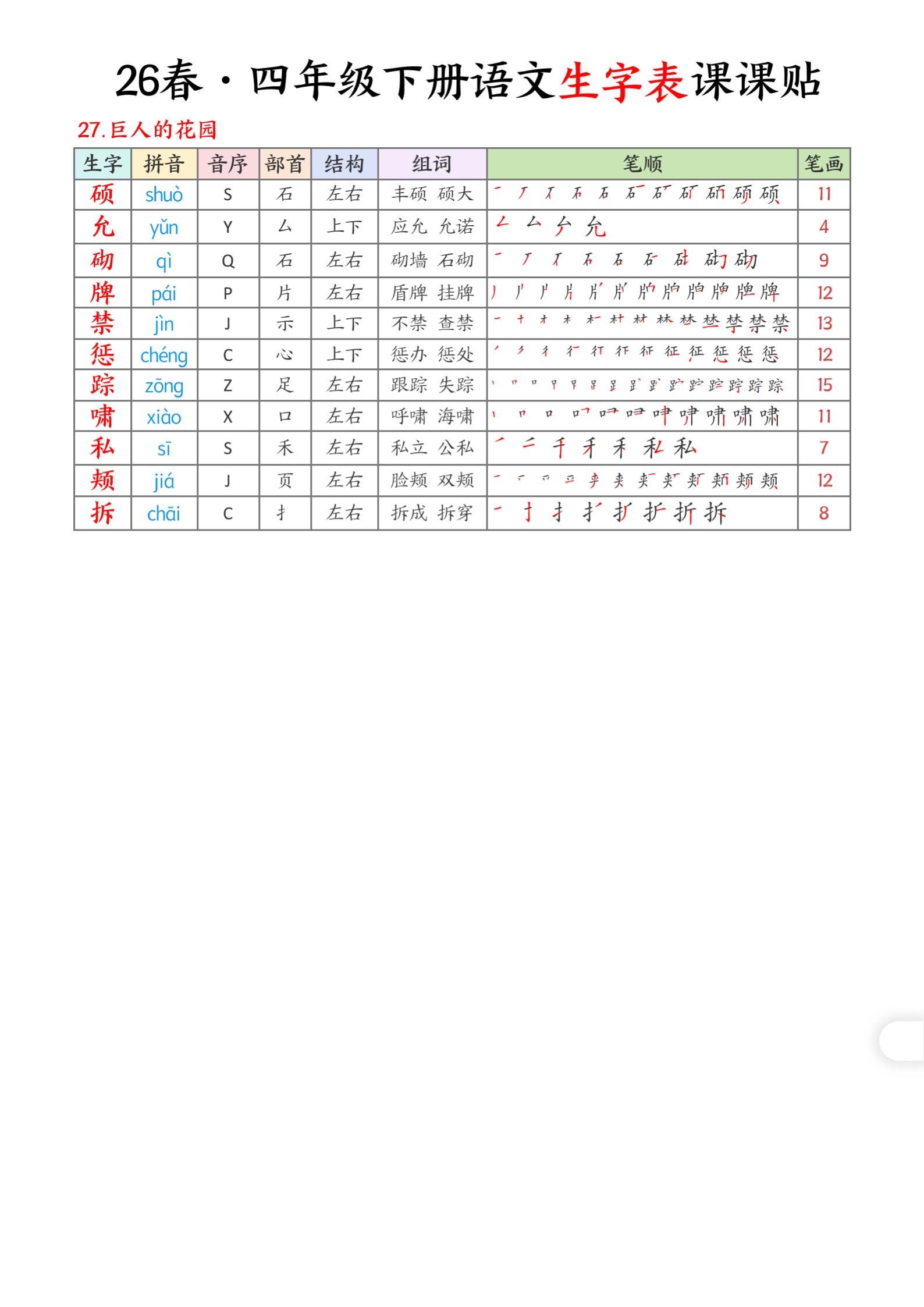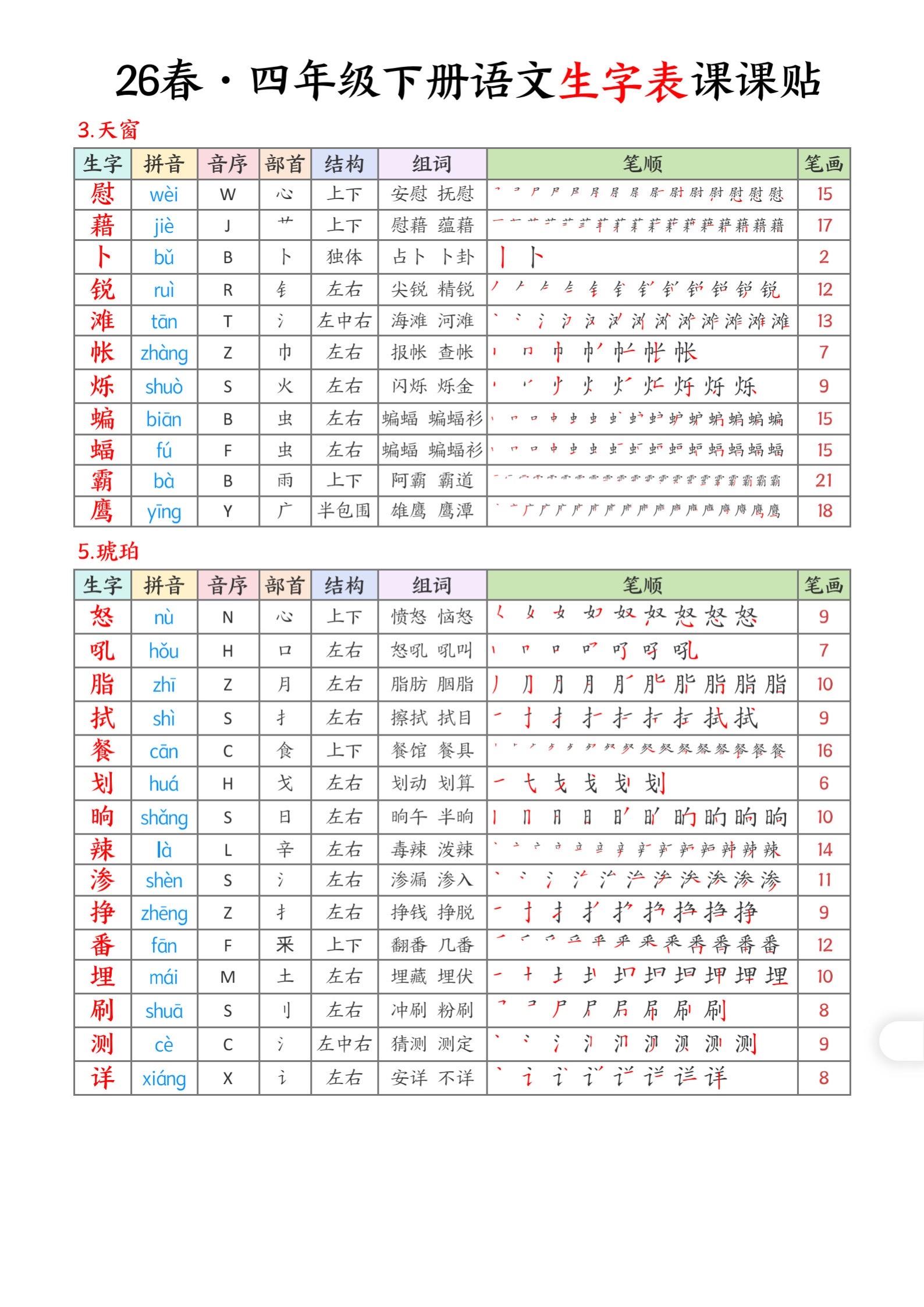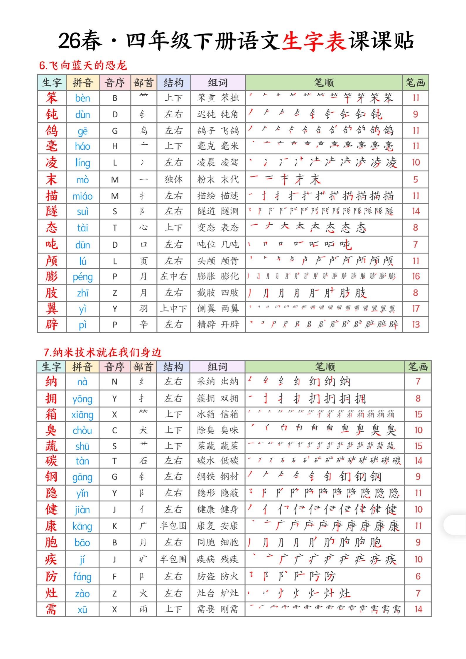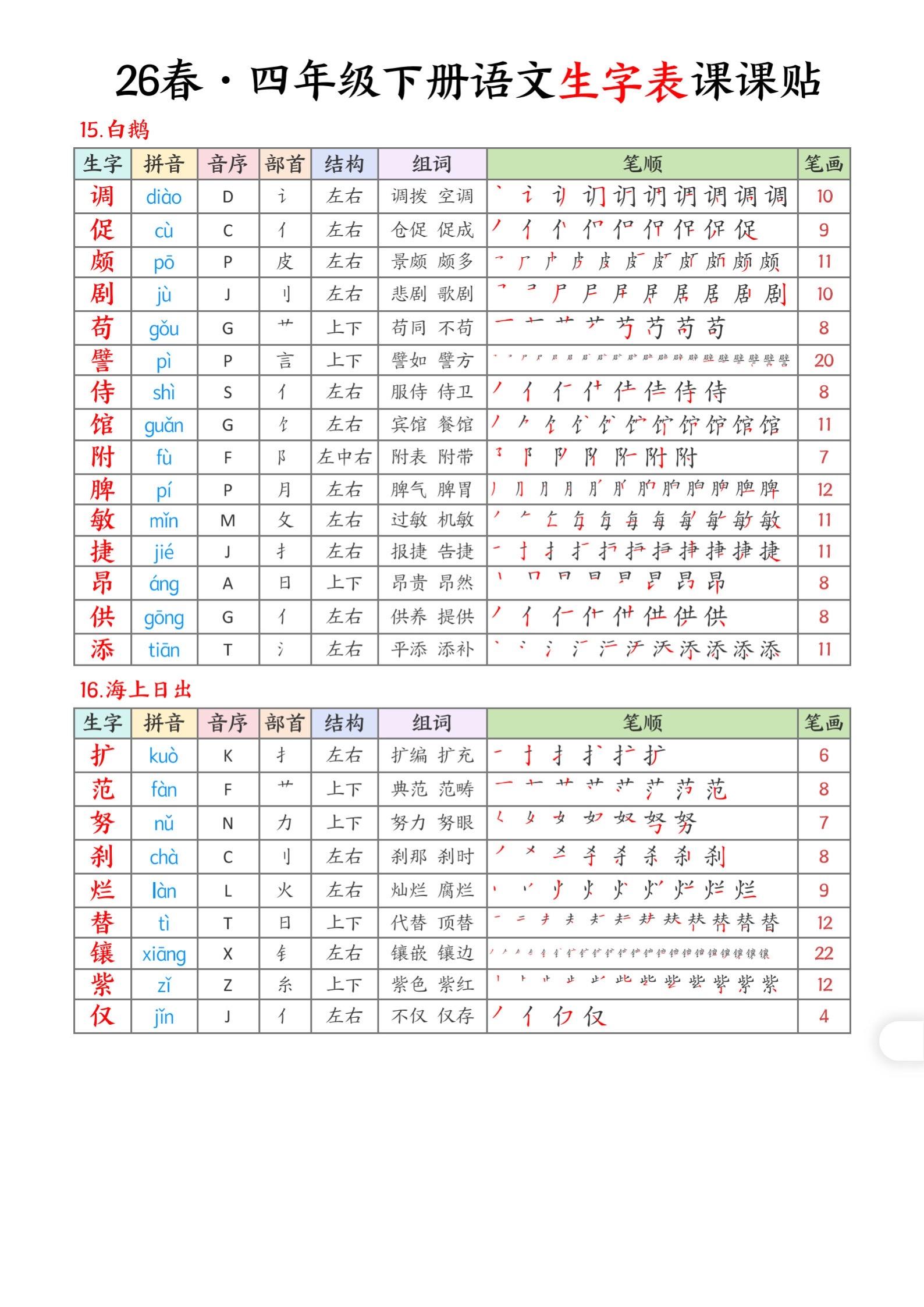 2026年春小学四年级语文下册生字帖课贴。坚持学习打卡 生字注音 生字帖 有需要可以自行保存打印