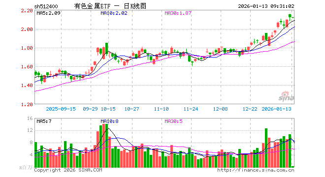 1月13日,有色金属ETF(512400)开盘涨0.05%,报2.119元。有色金属ETF(512400)重仓股方面,紫金矿业开盘涨0.38%,北方稀土涨0.02%,洛阳钼业跌0.26%,华友钴业跌1.15%,山东黄金跌0.47%,赣锋锂业涨1.02%,中国铝业跌0.36%,中金黄金涨0.40%,赤峰黄金涨0.06%,天齐锂业涨0.33%。