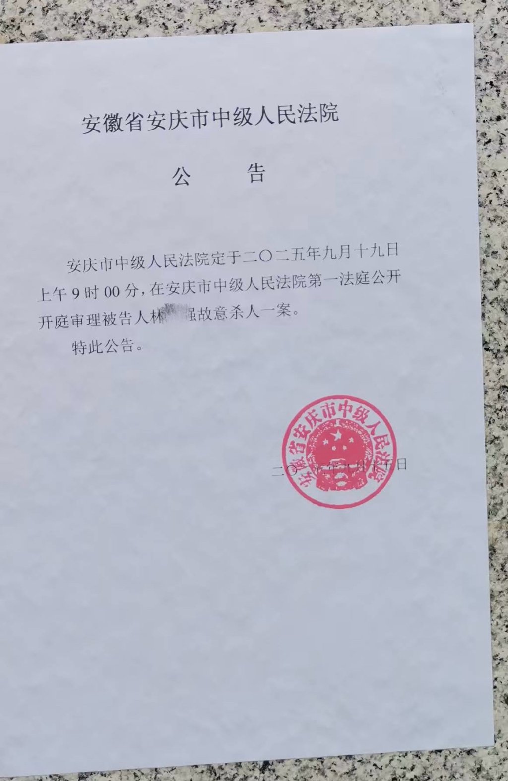 今年9月19日,林某强故意杀人一案在安庆中院开庭审理。本文图片来源受访者供图