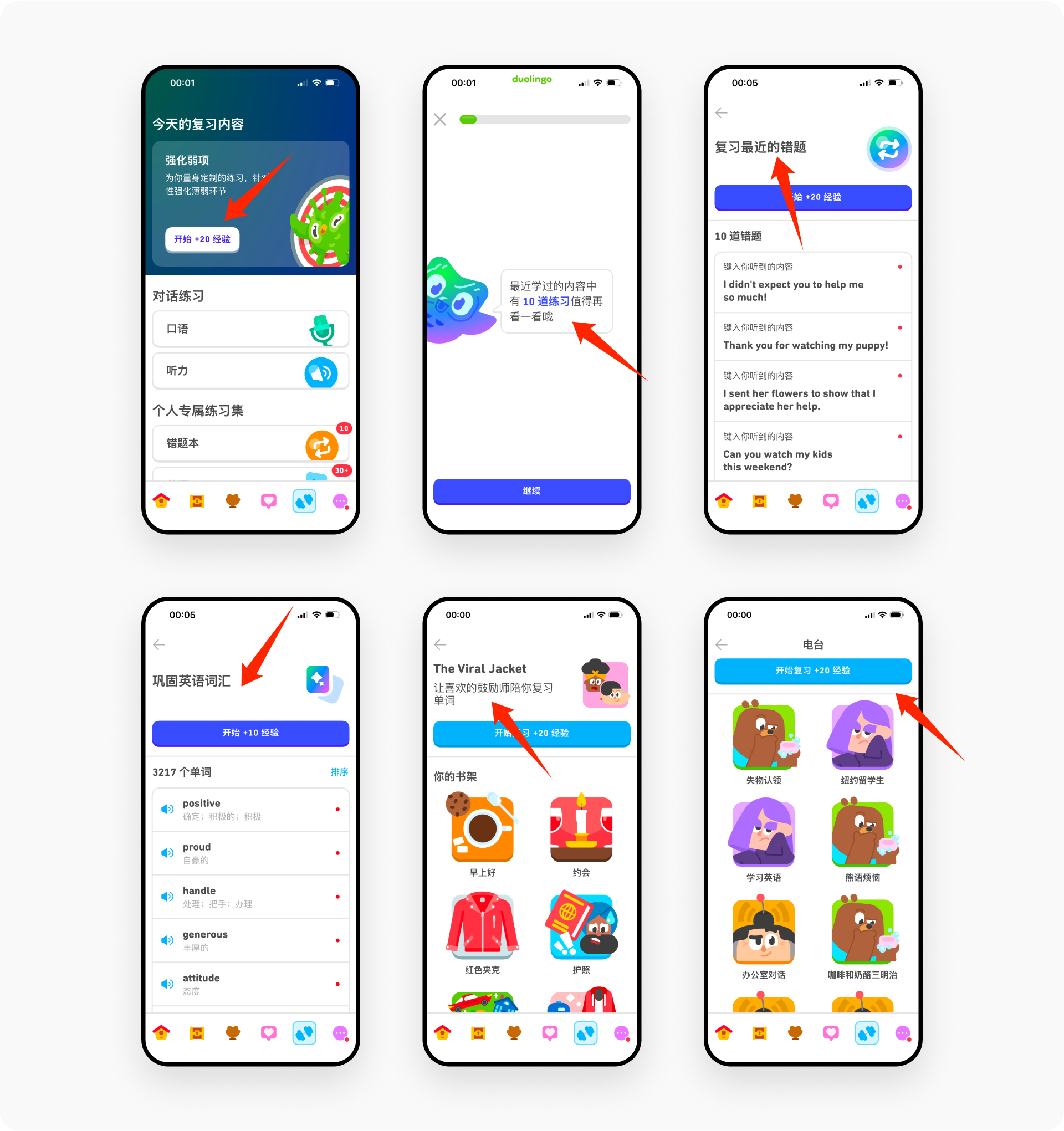 多邻国持续追踪用户的学习数据,自动生成”今日复习内容”。系统针对薄弱环节提供专项强化练习,如错题本、单词集、口语与听力训练等,让学习者始终处于最合适的复习状态,实现”量身定制”的学习路径。