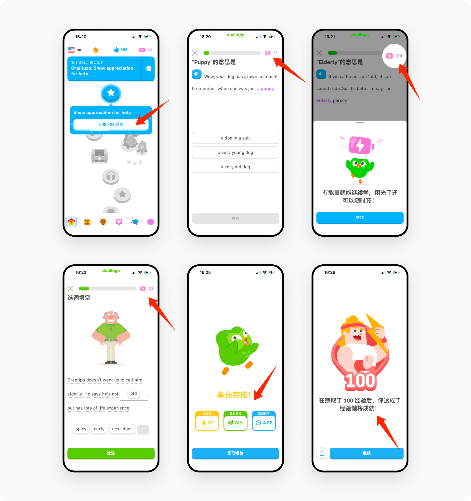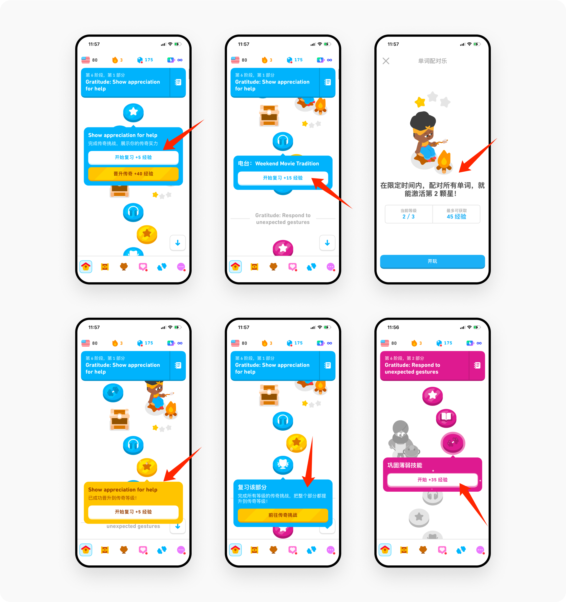 在单元开始前、学习中与完成后,多邻国会给出不同的”下一步”激励:开始前提示”可获得XX经验”,完成后提示”复习再得XX经验”,通过考核则解锁”传奇等级”。同时,地图上还埋入可点击的小人或图标,点击后进入轻量挑战或小游戏。整套设计将”学习—复习—进阶—彩蛋挑战”串成连续反馈链,持续拉动用户投入。