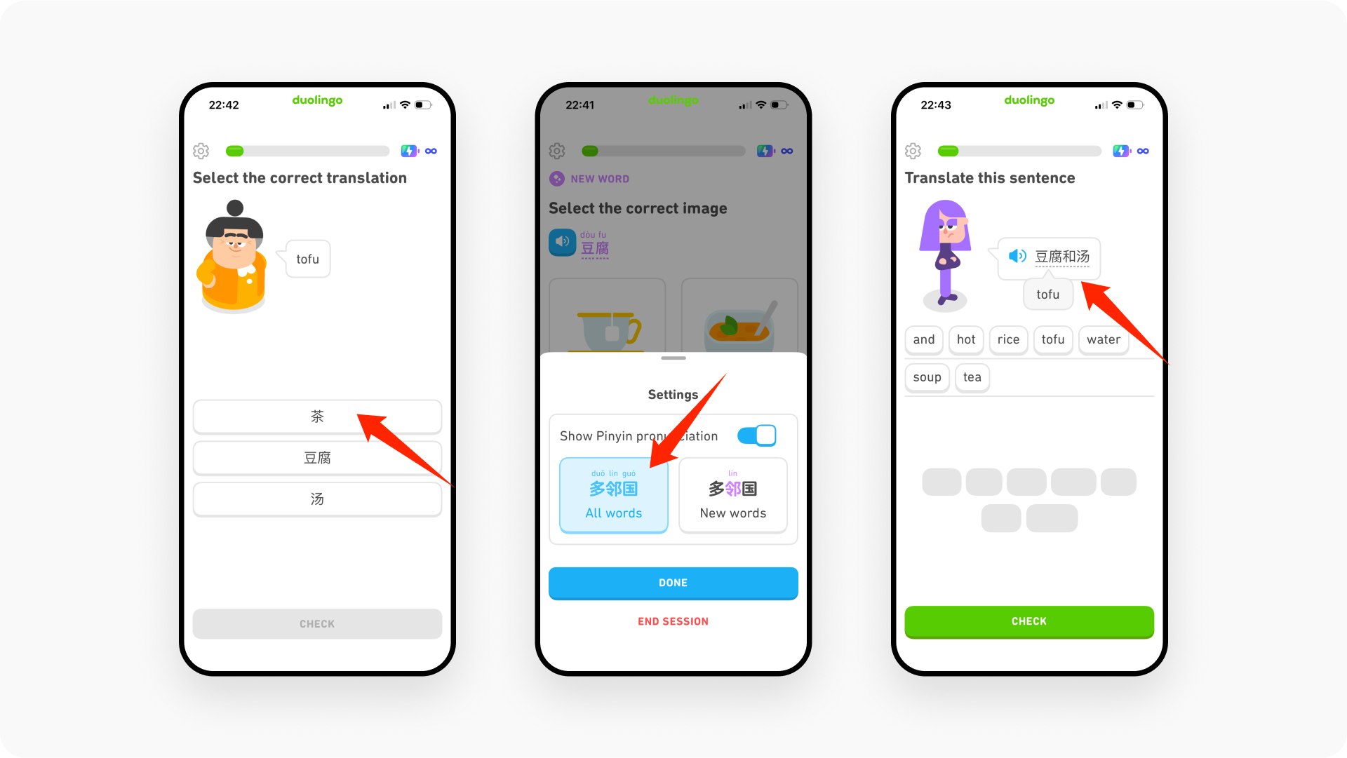 中文练习题中,点击左上角的设置,可选择汉字是否显示拼音。