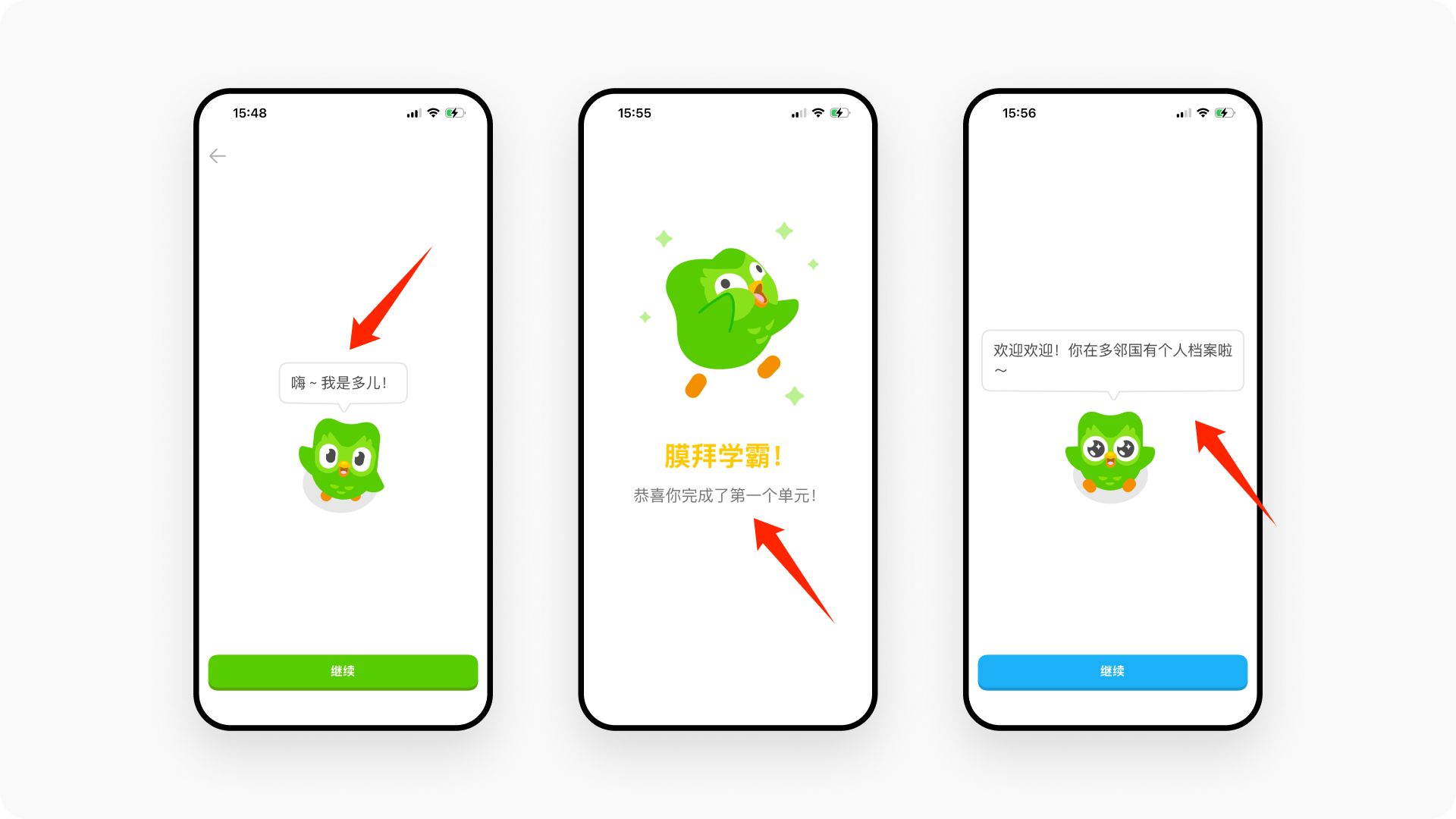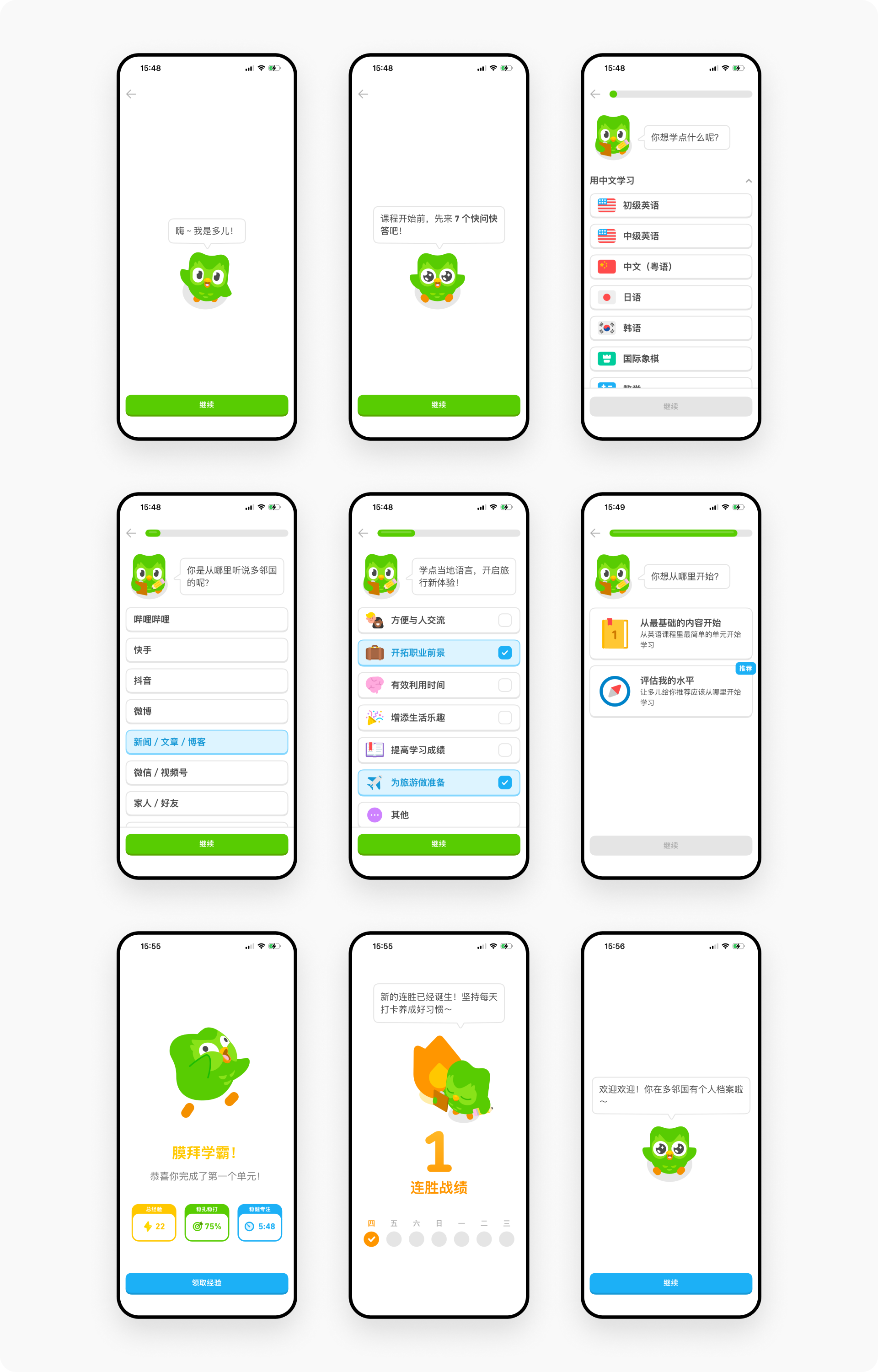 “嗨,我是多儿!”就是这样一句简单、轻松的开场白,为整个产品体验奠定了愉悦的基调。品牌IP的拟人化不仅拉近了产品与用户的距离,更通过形象传递出的氛围、温度和气质给用户留下深刻印象。相比Airbnb、Vocabulary等我们刚拆解过的国外产品,多邻国的Onboarding流程虽然看起来略显冗长(可能是国内用户不太有耐心),但实际上被这只可爱的猫头鹰化解了。因此,品牌IP形象的设计不容忽视——它不是一个静态的拟物标志,而是与用户快速建立连接的桥梁。