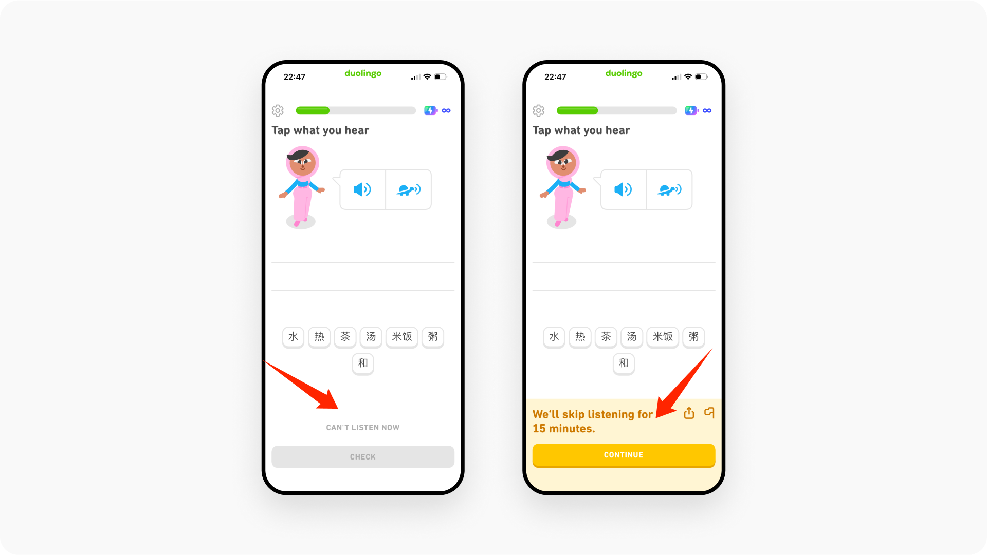 如果出现音频播放和乌龟图标,音频代表正常语速,乌龟则是0.5x播放速度,帮助用户听得更清楚。