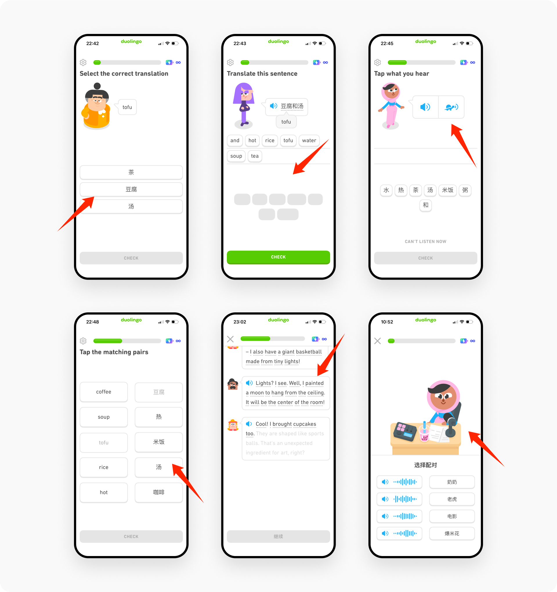 多邻国的课程体系包含选择题、填空题、口语题、场景题、配对题、听力题等多种互动形式。每种题型通过轻量化交互和视觉辅助,帮助用户在不同维度上强化记忆与理解。听力题训练语音辨识能力,配对题促进词汇联想,场景题模拟真实语境,提升语言的实际应用能力。