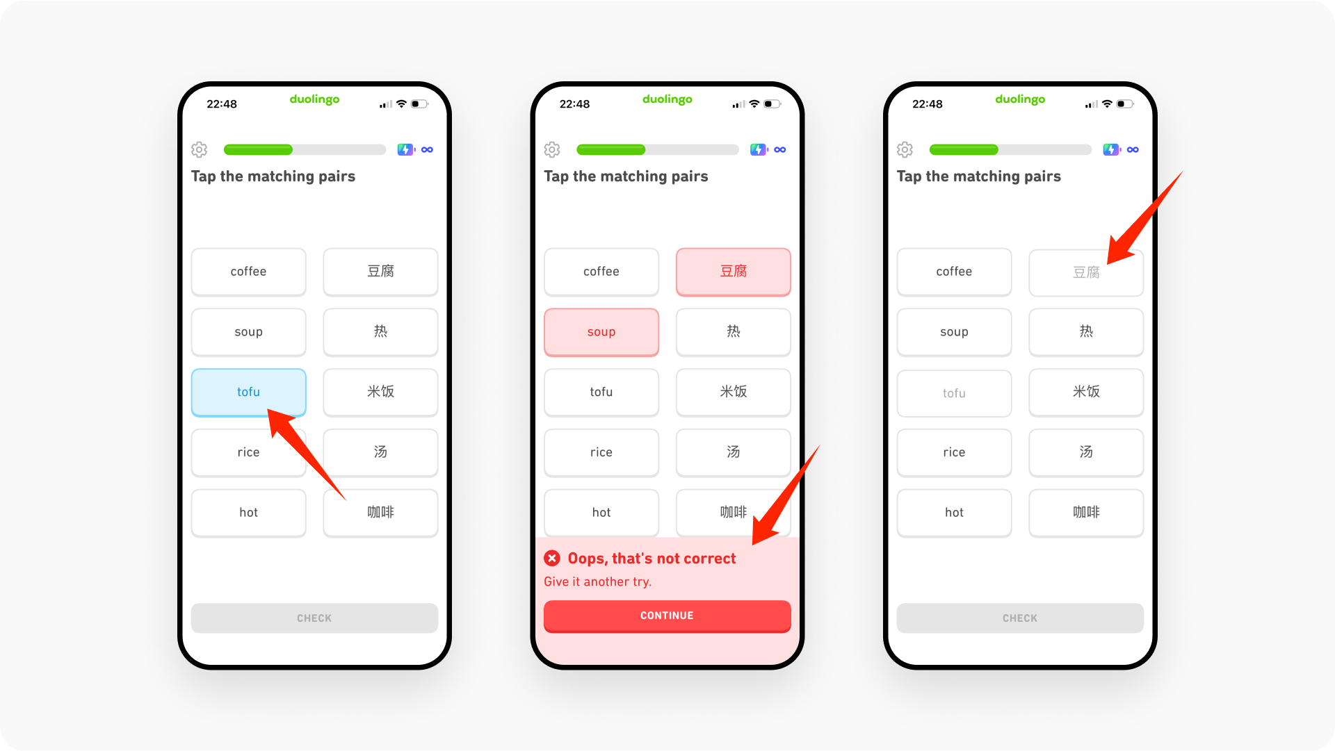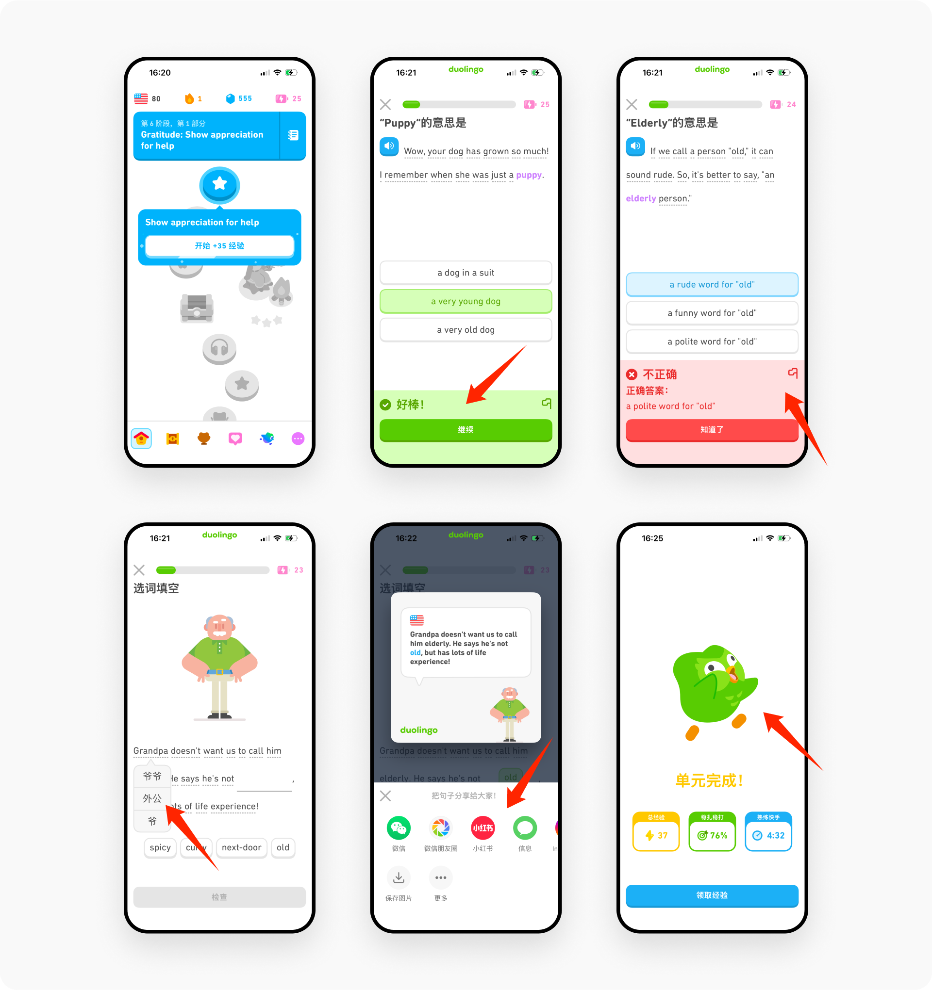作为多邻国最核心的功能,这里既是用户的学习空间,也是与产品交互的主要场景。多邻国将即时反馈机制融入整个学习过程,通过视觉与情绪的双重信号强化学习动机。这种”边学边奖”的反馈方式能有效提升学习者的专注度与自信心,通过正向情感驱动形成长期学习习惯——这正是教育产品维持高留存率的关键。一旦忽略这些即时反馈细节,整个产品体验将大打折扣,千万不要忽视这些微交互细节。