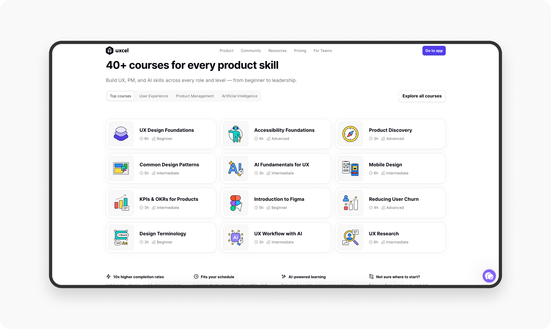 这几乎是语言学习产品的通用设计策略。语言学习内容庞大,用户需要从易到难、从浅到深逐步推进。将课程拆分为不同单元并清晰展示,能让用户对学习目标和进度一目了然,有效提升学习效果。这让我想起另一款职业在线教育产品Uxcel的课程设计——虽然它不是语言学习类产品,但采用了另一个维度:按场景划分,将UX学习按不同知识点和应用场景分开。