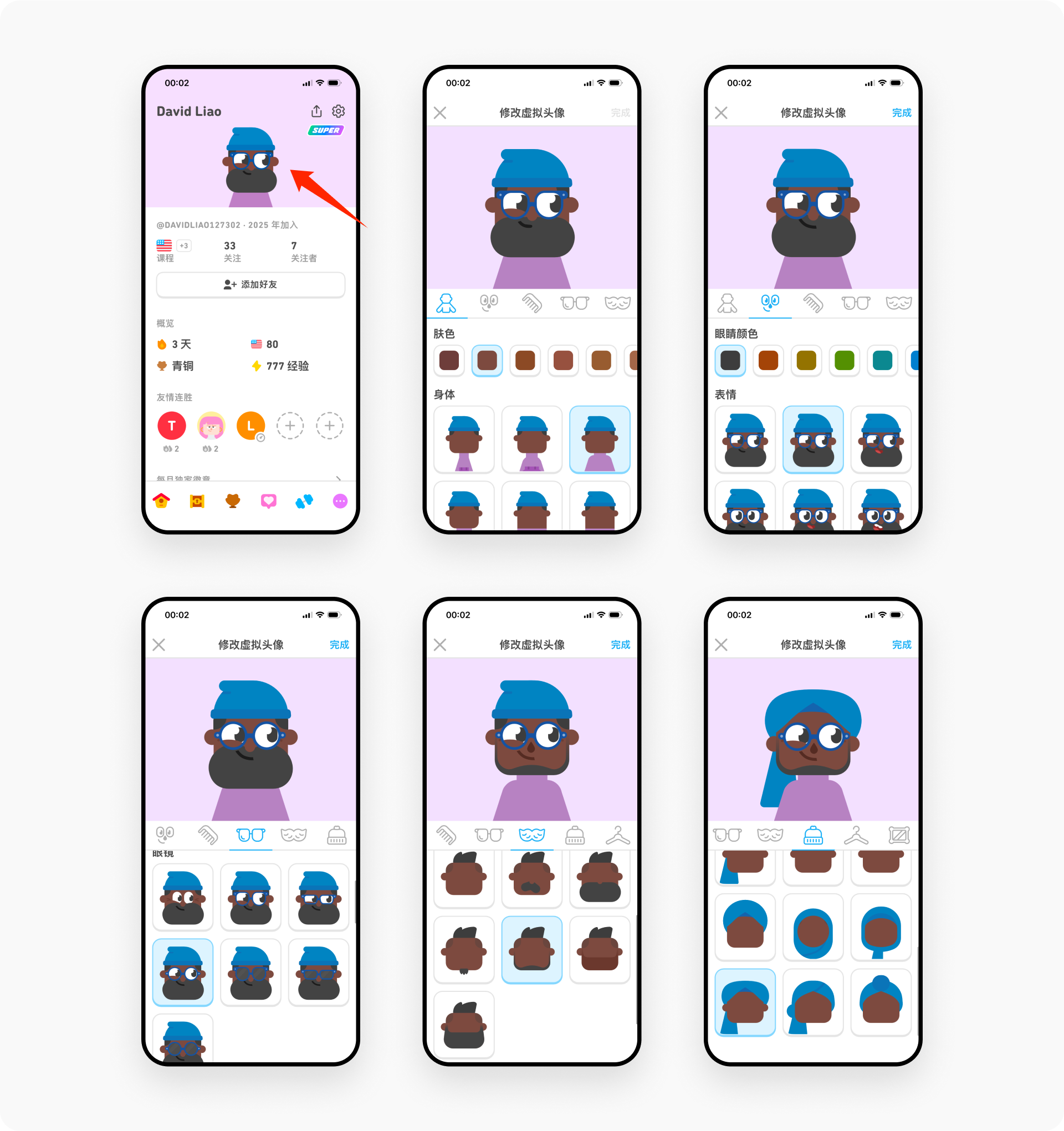 多邻国的视觉风格独树一帜,辨识度极高,这一设计理念贯穿于产品的每个功能。头像设计尤其个性化——用户可以根据个人偏好自由选择肤色、发型、衣服颜色等元素,拥有充分的自主权。这种让用户”亲手打造”头像的方式,能显著提升心理所有权与身份认同,从而提高留存与分享意愿,实现个性化×可控性的平衡。